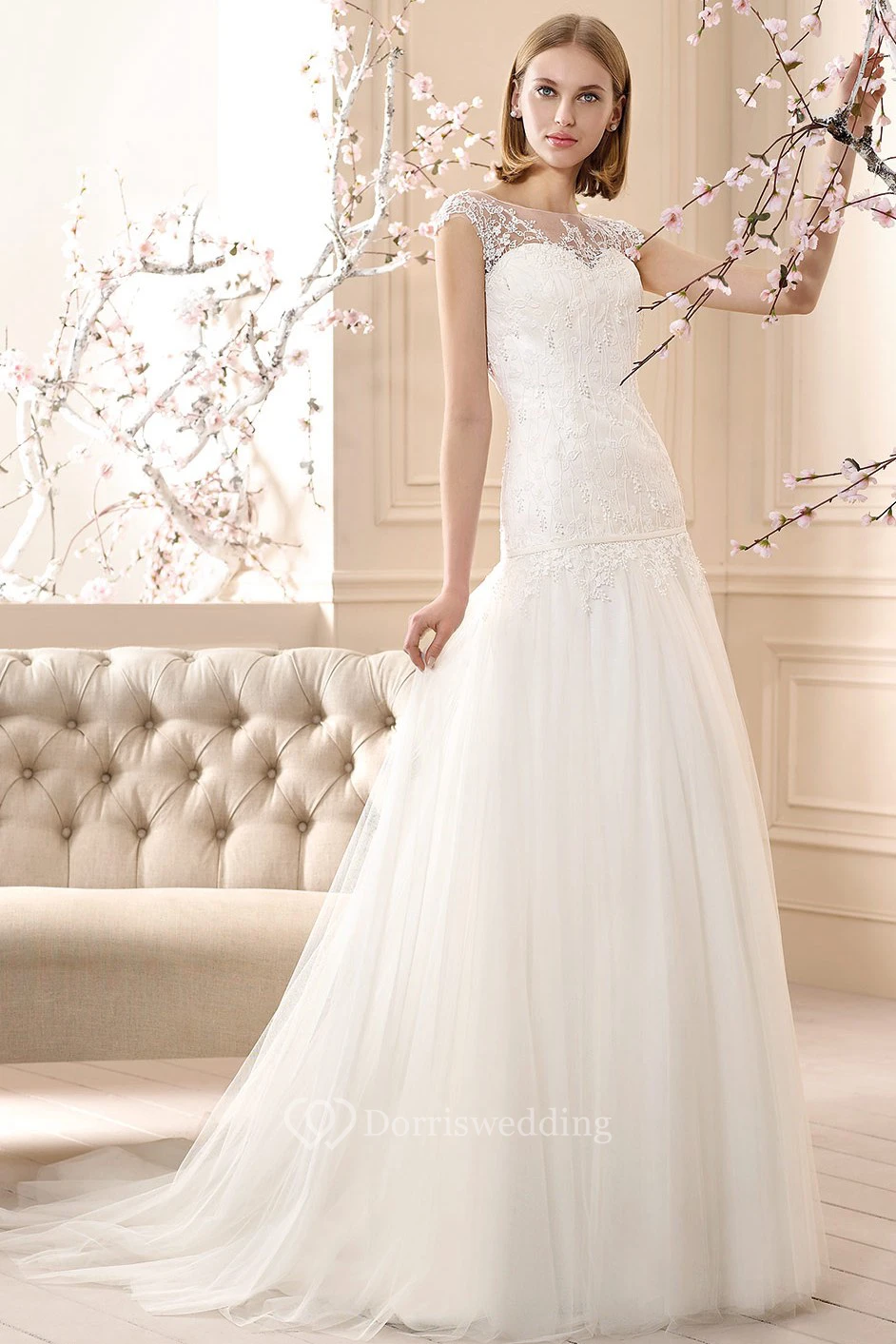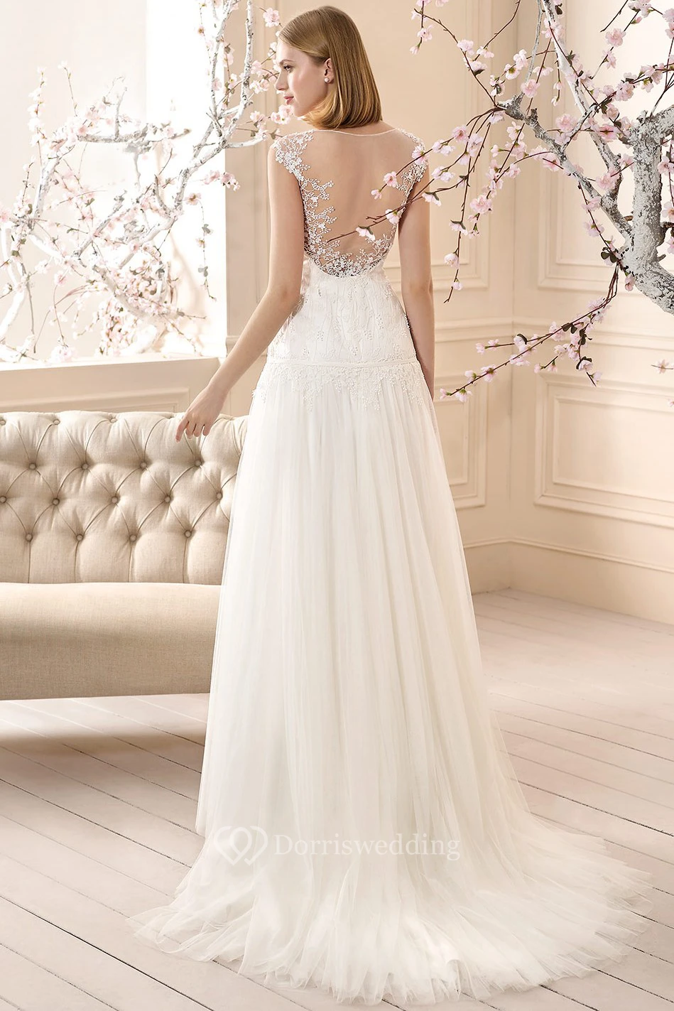 A-Line Maxi Appliqued Bateau-Neck Cap-Sleeve Tulle Wedding Dress
