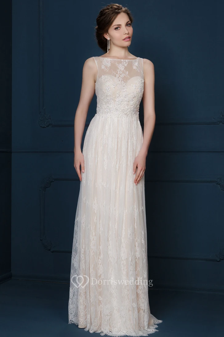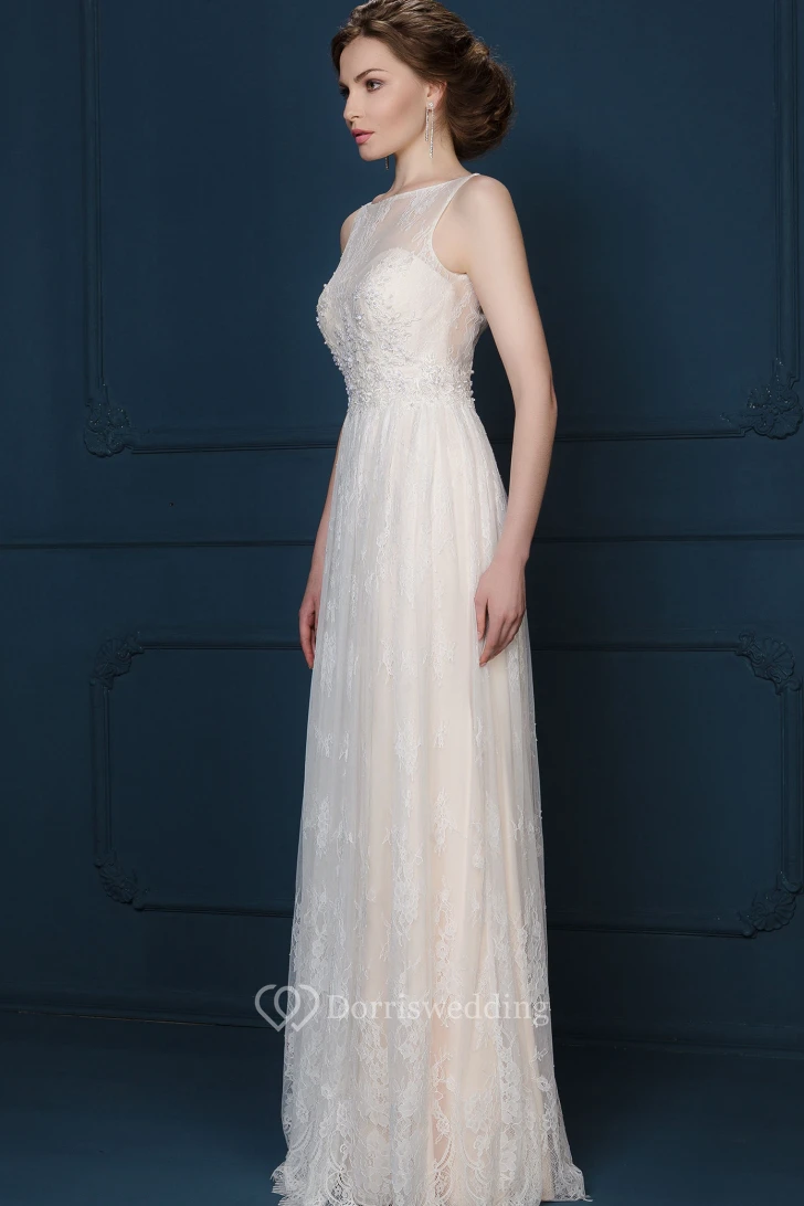 A-Line Maxi Appliqued Bateau-Neck Sleeveless Lace Evening Dress With Pleats