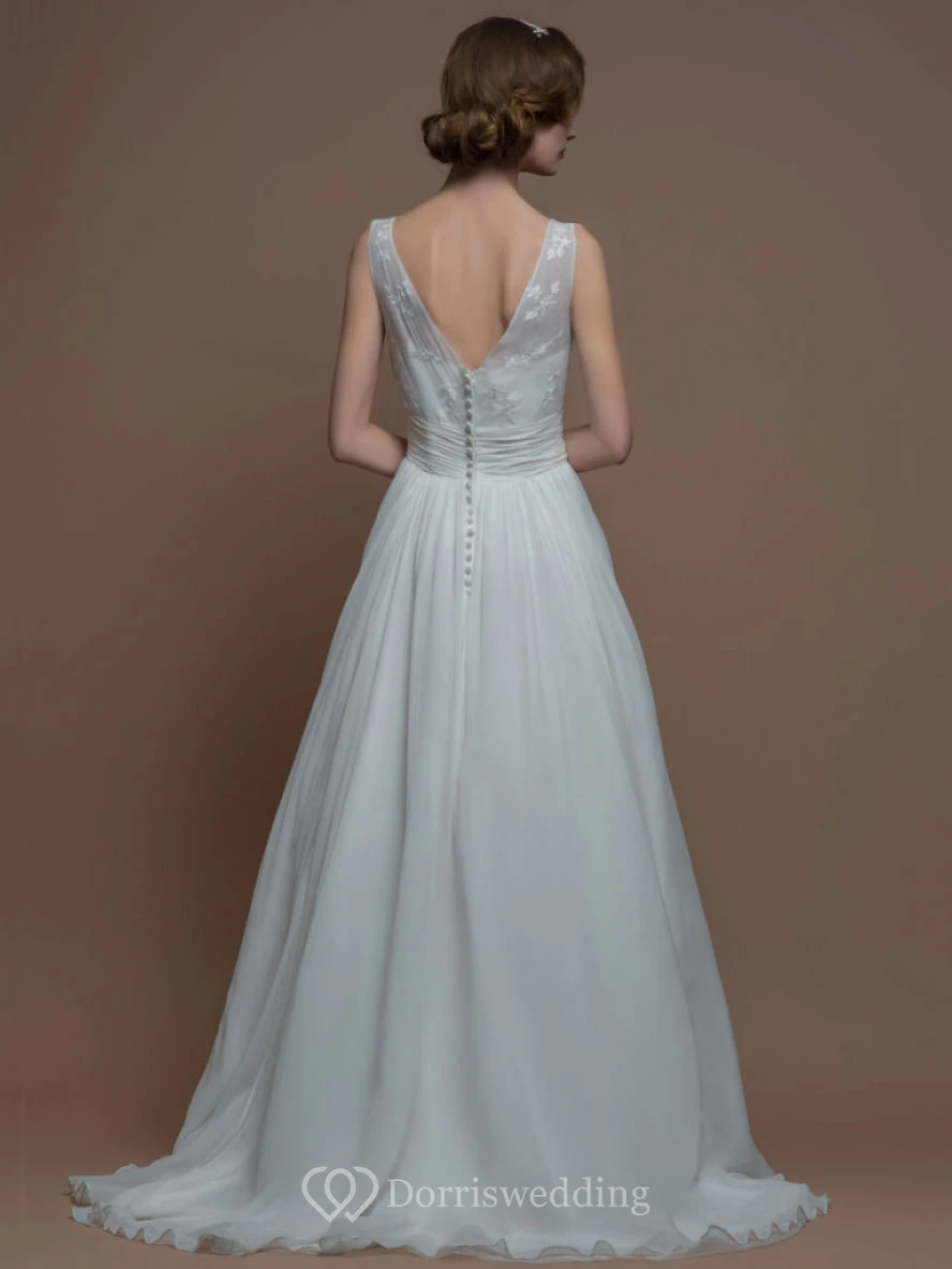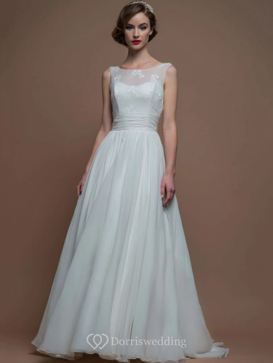 A-Line Maxi Appliqued Bateau Sleeveless Wedding Dress With Sweep Train And Low-V Back