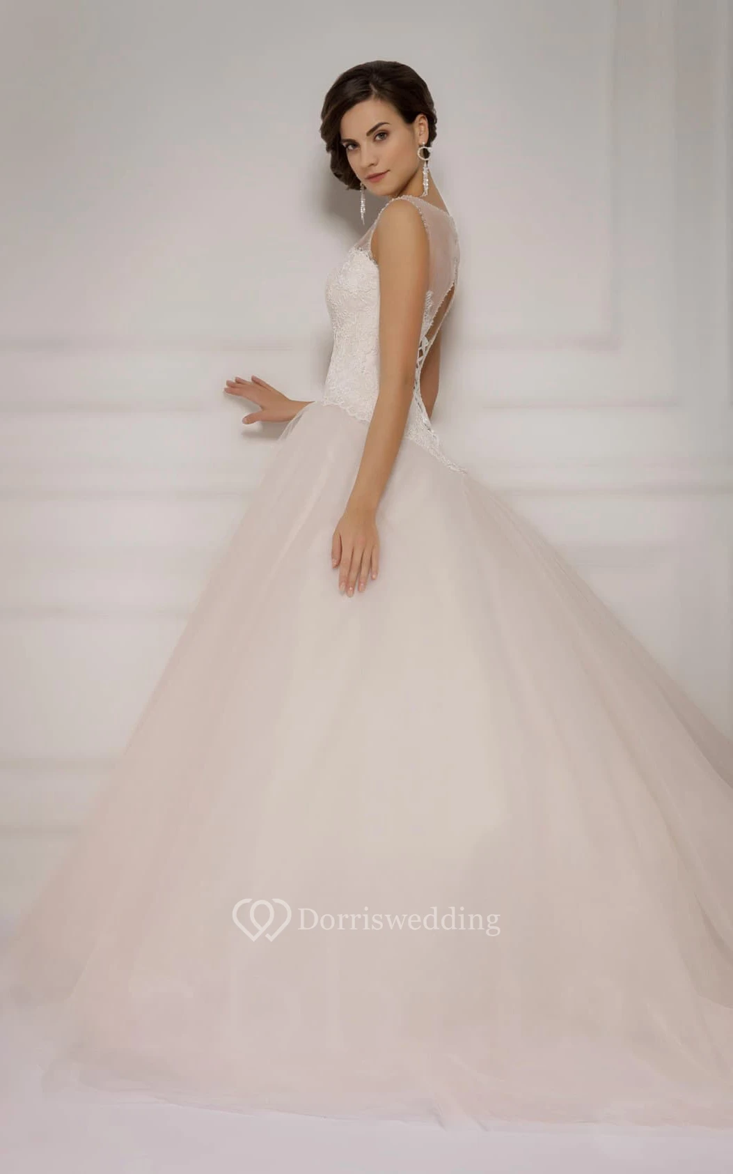 A-Line Maxi Bateau-Neck Sleeveless Lace-Up Tulle Dress With Lace Appliques And Keyhole