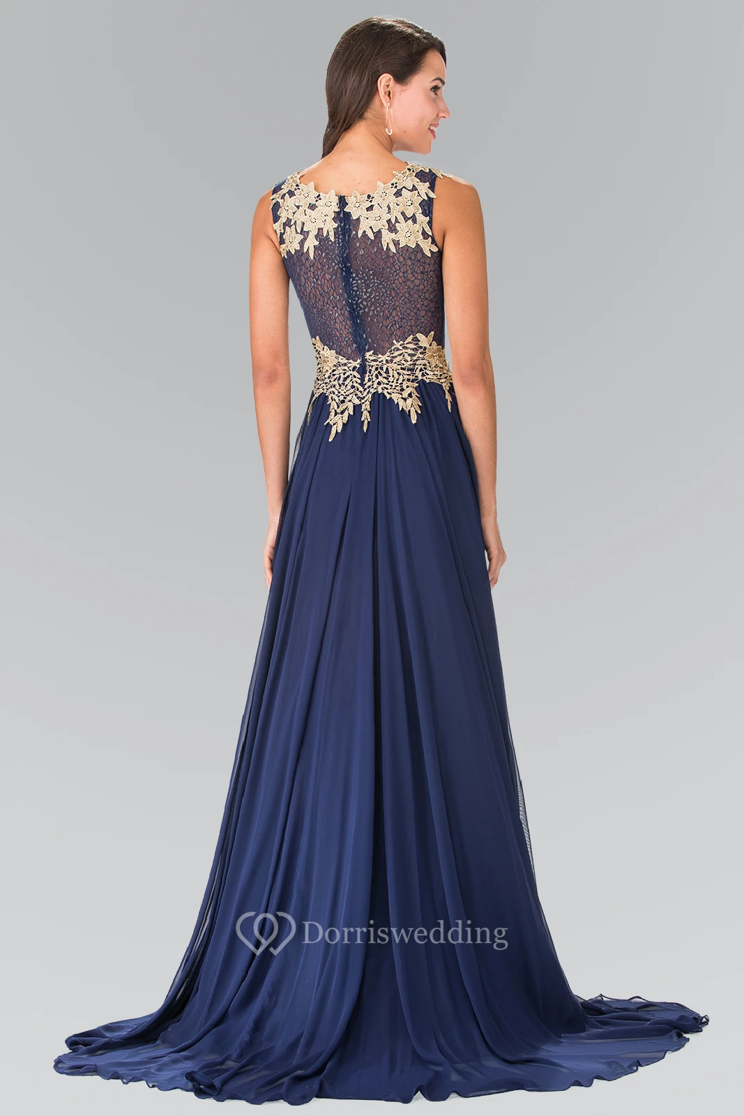A-Line Maxi Bateau Sleeveless Chiffon Illusion Dress With Appliques And Pleats
