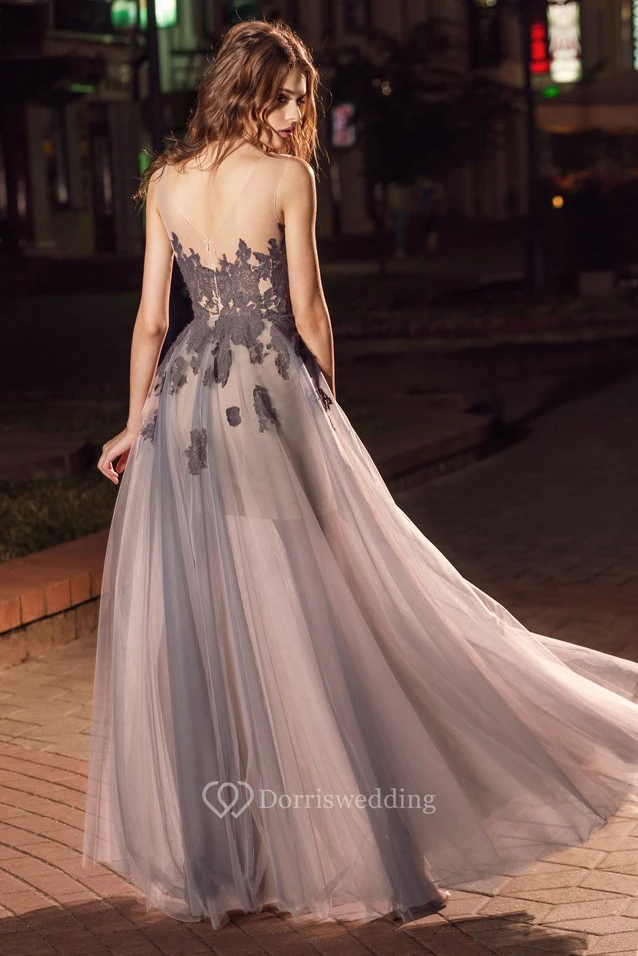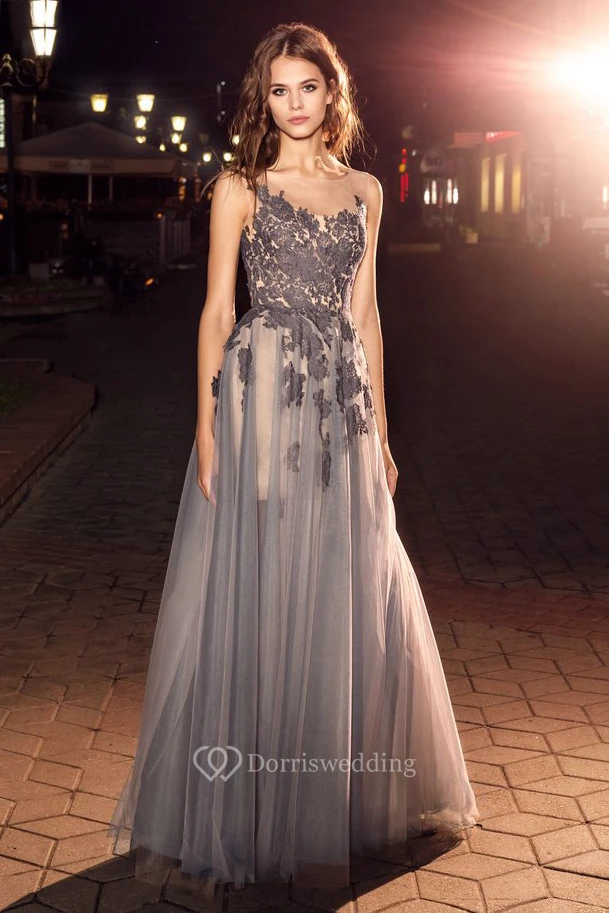 A-Line Maxi Bateau Sleeveless Tulle Low-V Back Dress With Appliques And Pleats