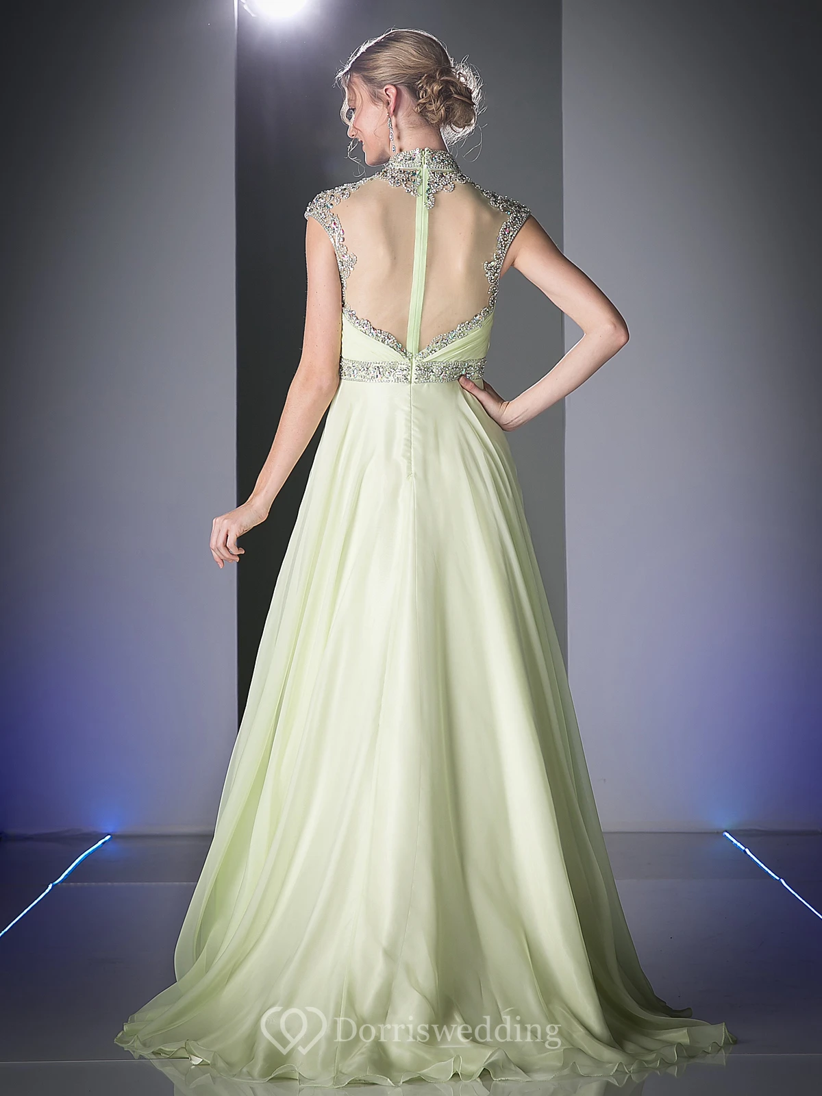 A-Line Maxi High Neck Cap-Sleeve Illusion Dress With Beading And Ruching