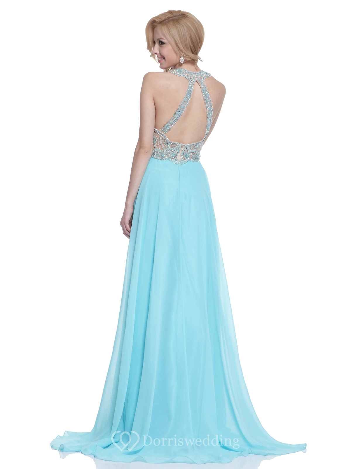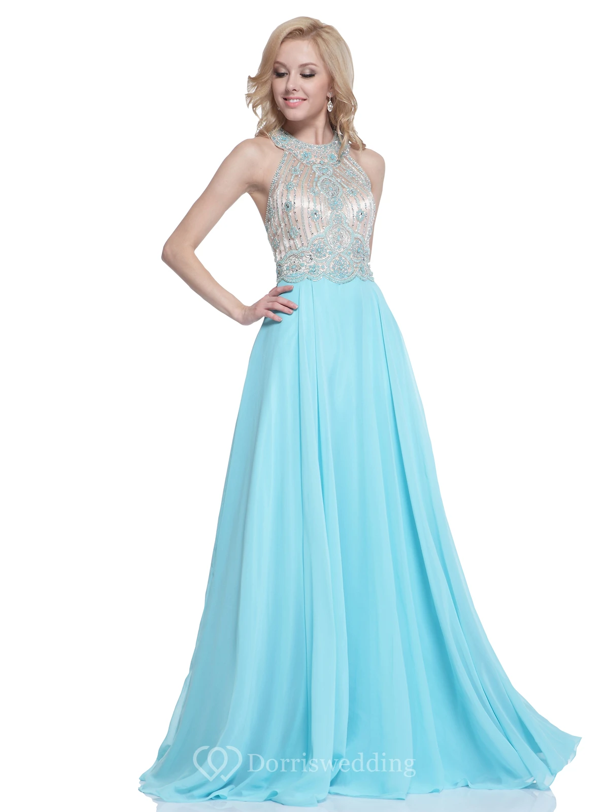 A-Line Maxi High Neck Sleeveless Chiffon Straps Dress With Beading And Pleats