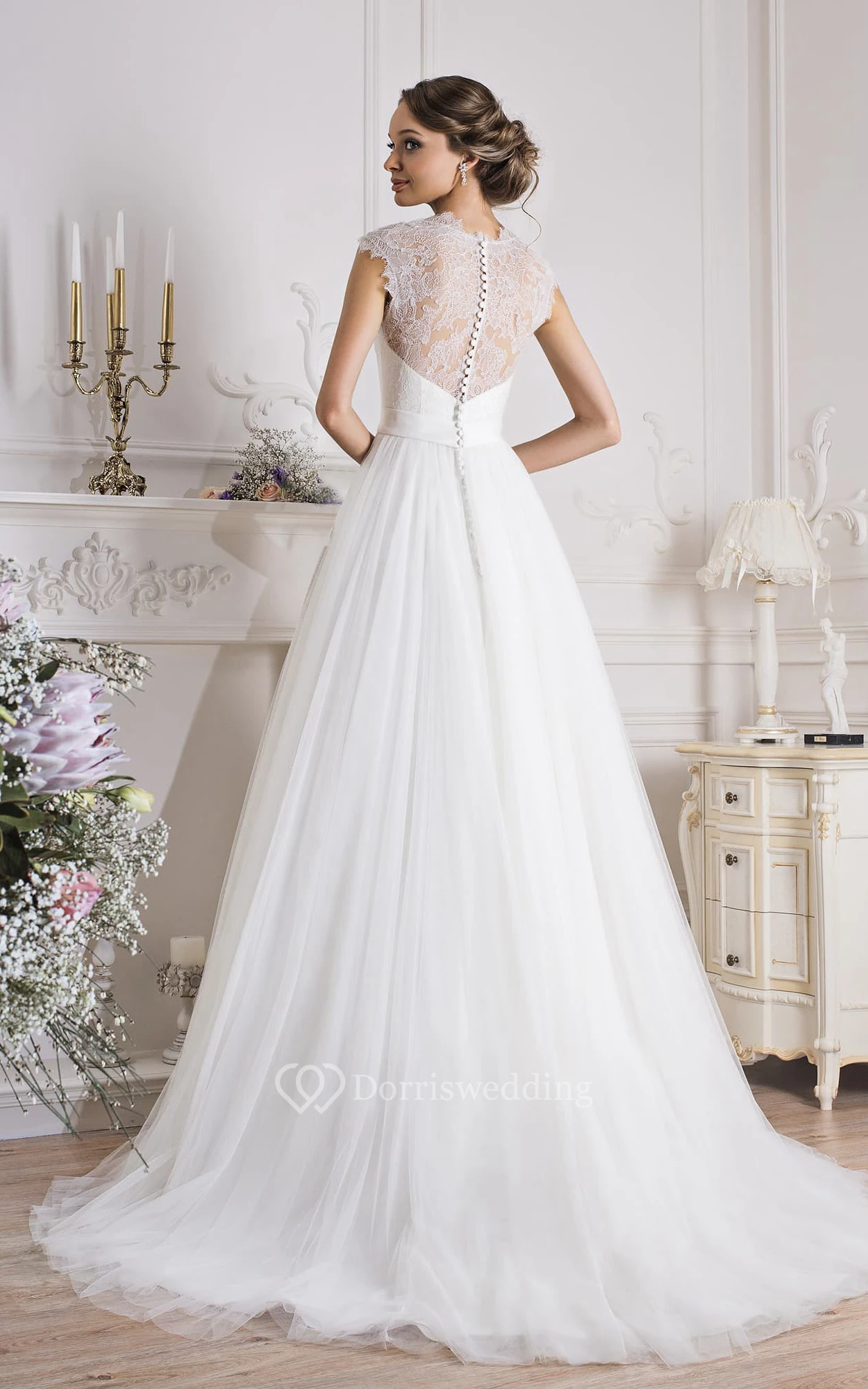 A-Line Maxi High-Neck Sleeveless Illusion Tulle Lace Dress With Waist Jewellery