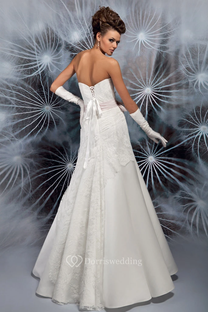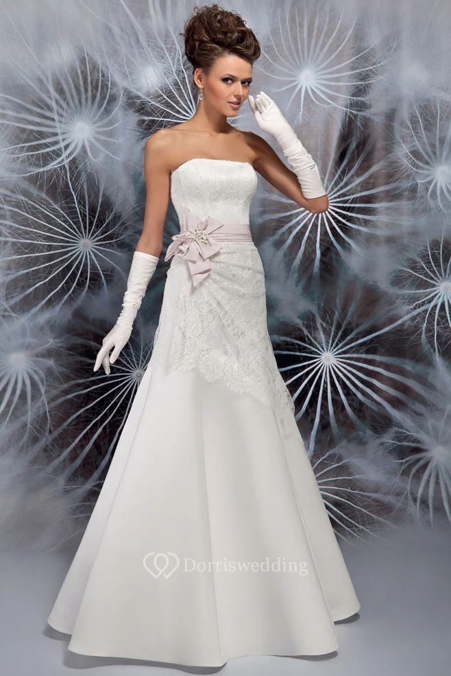 A-Line Maxi Lace Strapless Sleeveless Satin Wedding Dress With Ruching And Bow