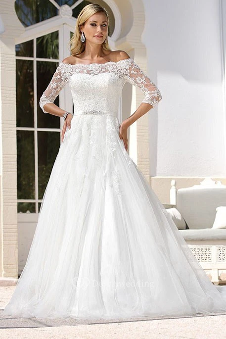 A-Line Maxi Off-The-Shoulder 3-4-Sleeve Tulle Wedding Dress With Appliques