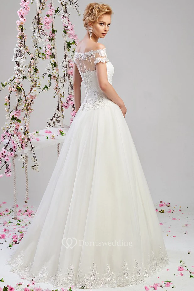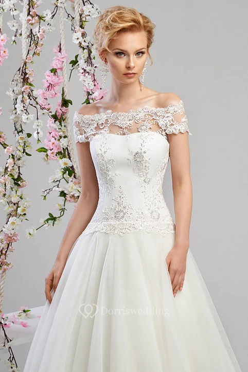 A-Line Maxi Off-The-Shoulder Appliqued Tulle&Satin Wedding Dress