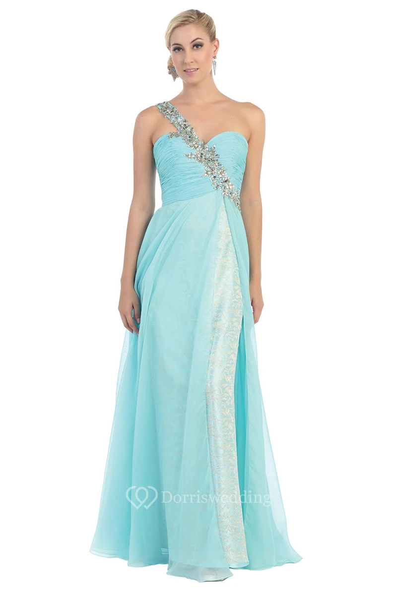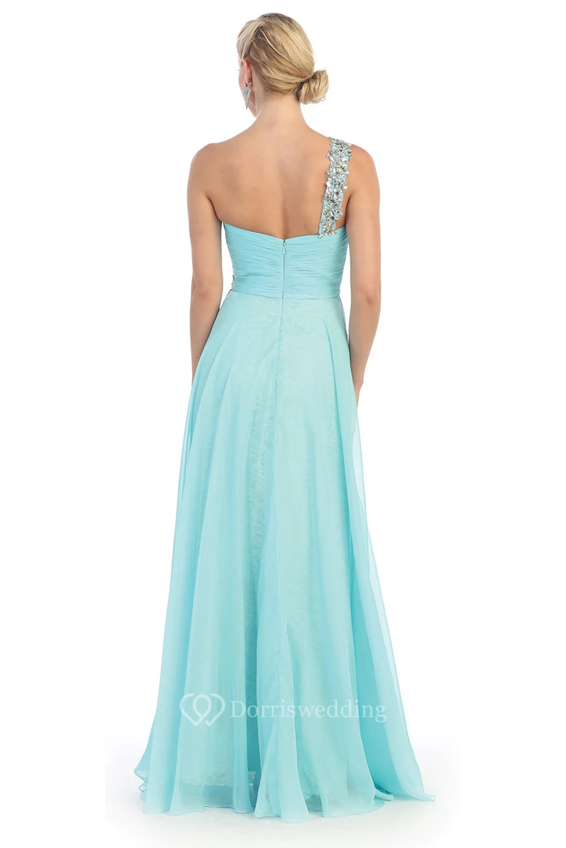 A-Line Maxi One-Shoulder Chiffon Lace Zipper Dress With Ruching And Beading