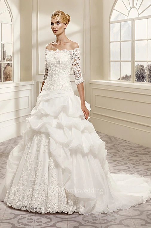 A-Line Maxi Pick-Up Half-Sleeve Off-The-Shoulder Organza Wedding Dress With Appliques And Tiers
