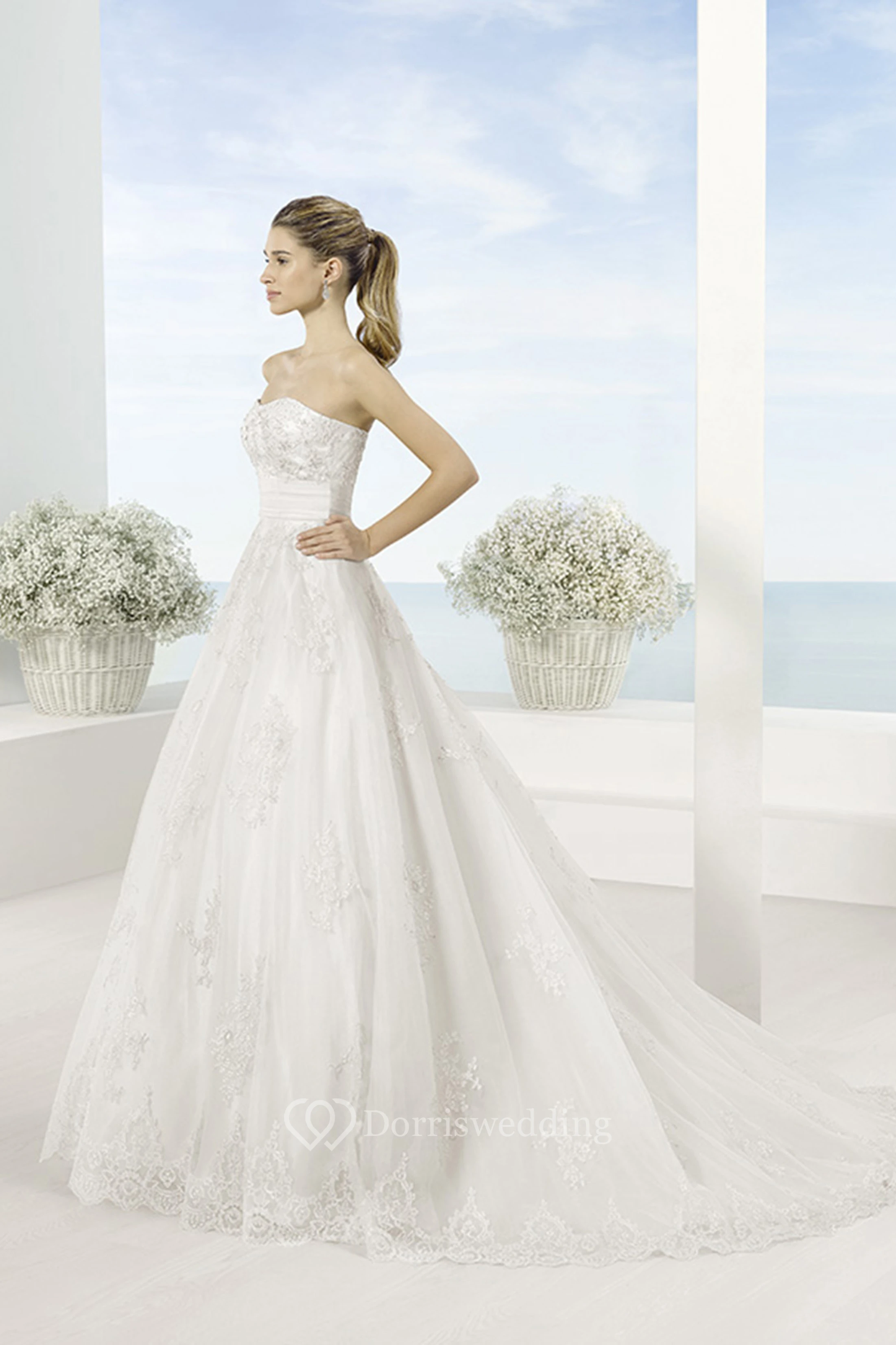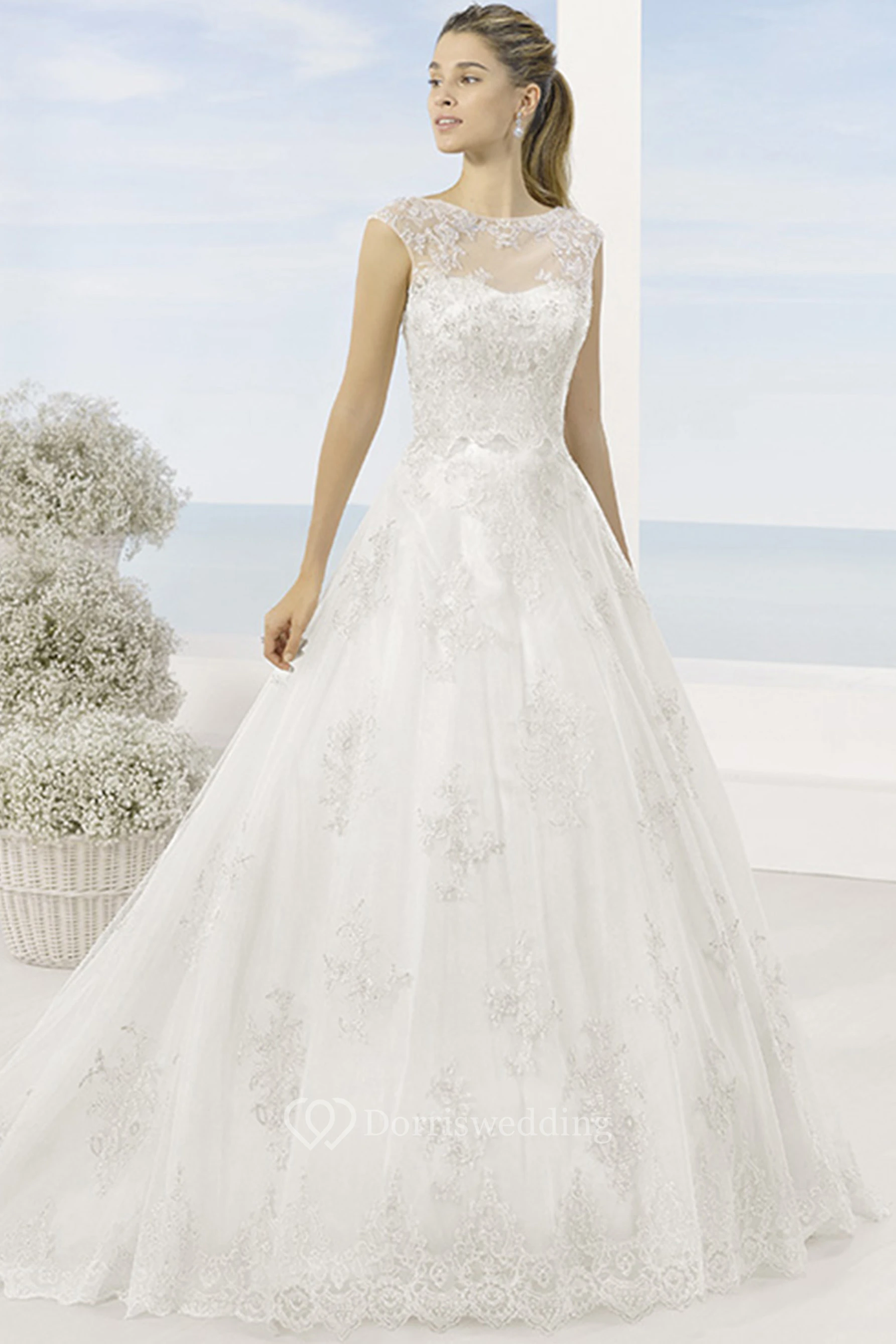 A-Line Maxi Scoop Appliqued Cap-Sleeve Lace Wedding Dress With Chapel Train