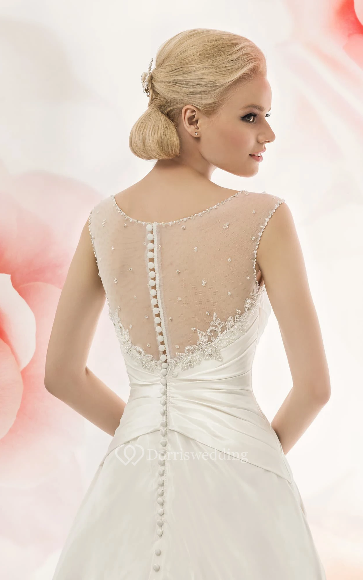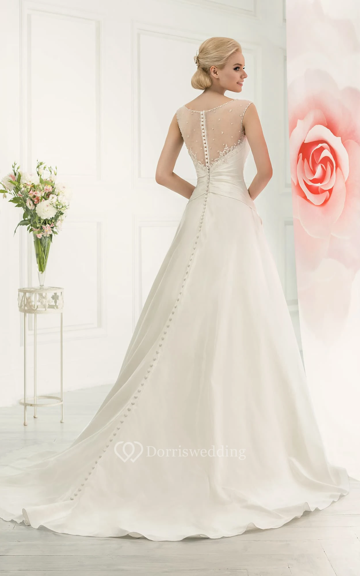 A-Line Maxi Scoop Cap-Sleeve Illusion Satin Dress With Side Draping And Beading