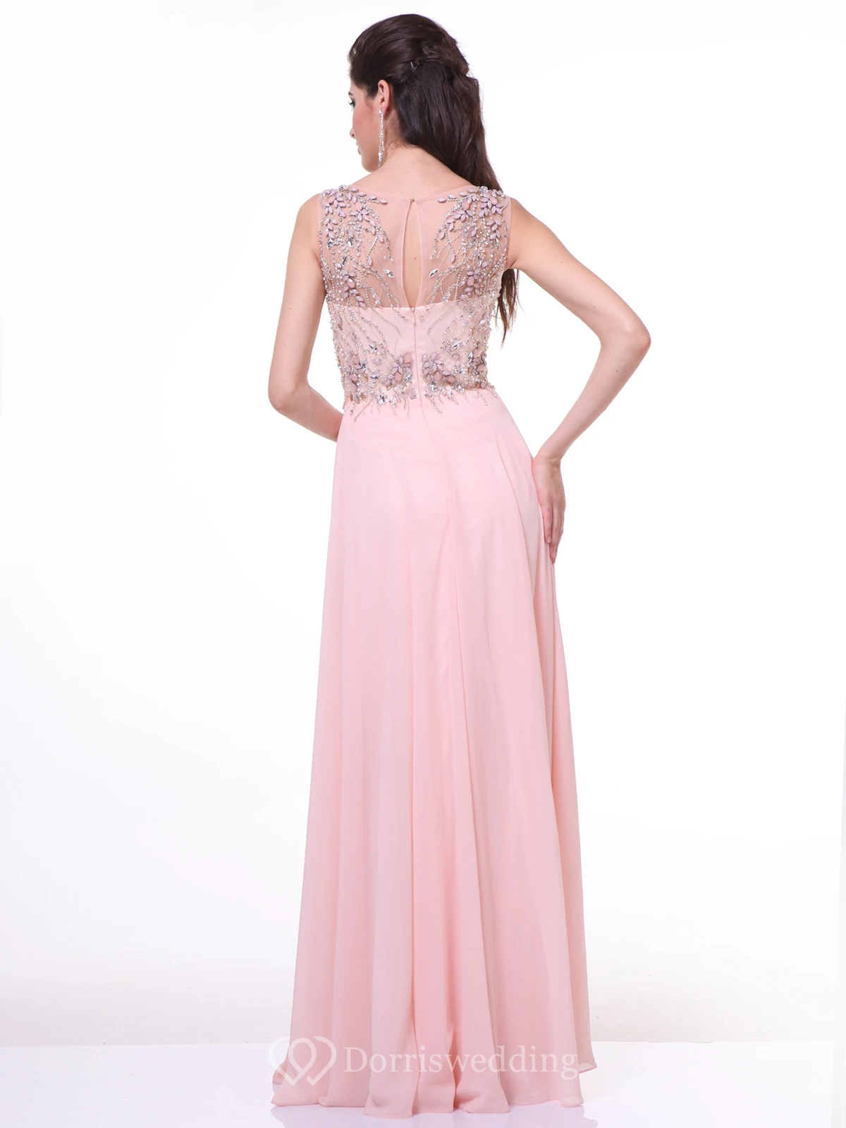 A-Line Maxi Scoop-Neck Sleeveless Chiffon Illusion Dress With Beading And Pleats