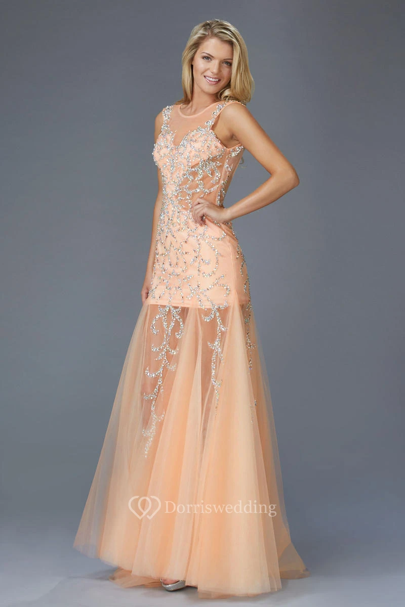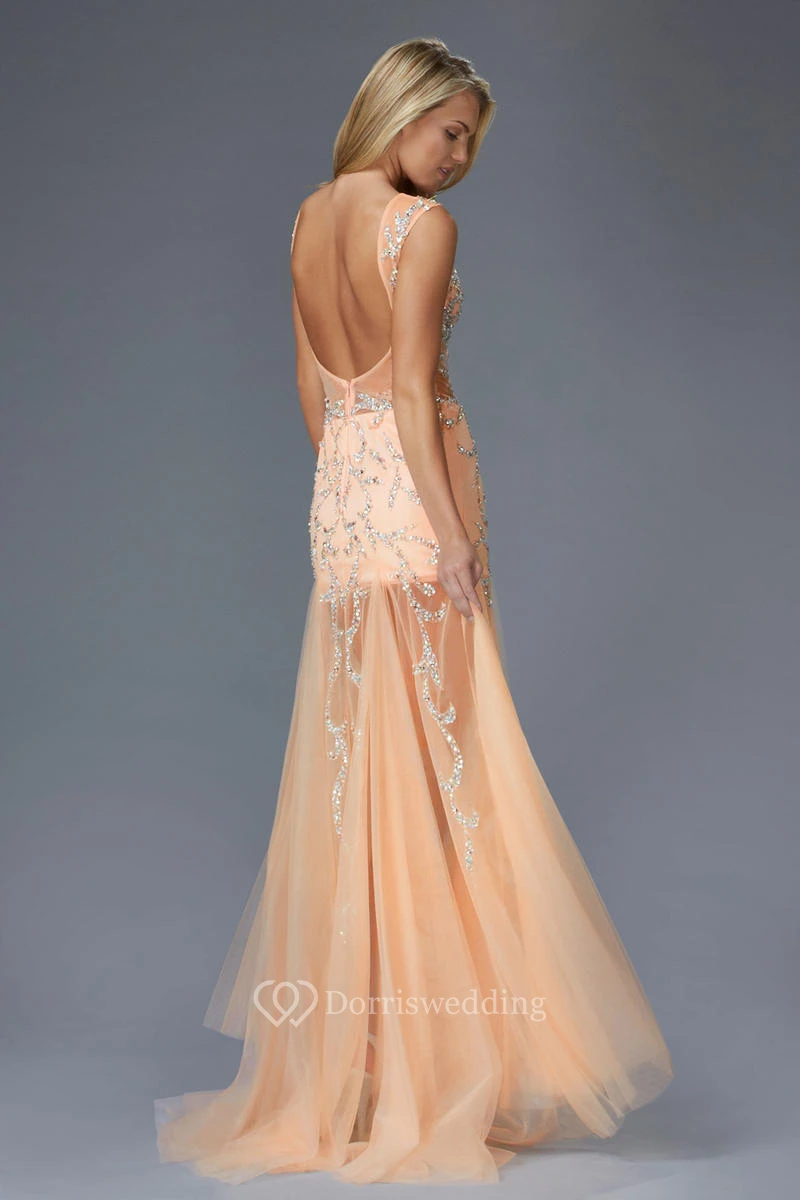 A-Line Maxi Scoop-Neck Sleeveless Tulle Low-V Back Dress With Beading
