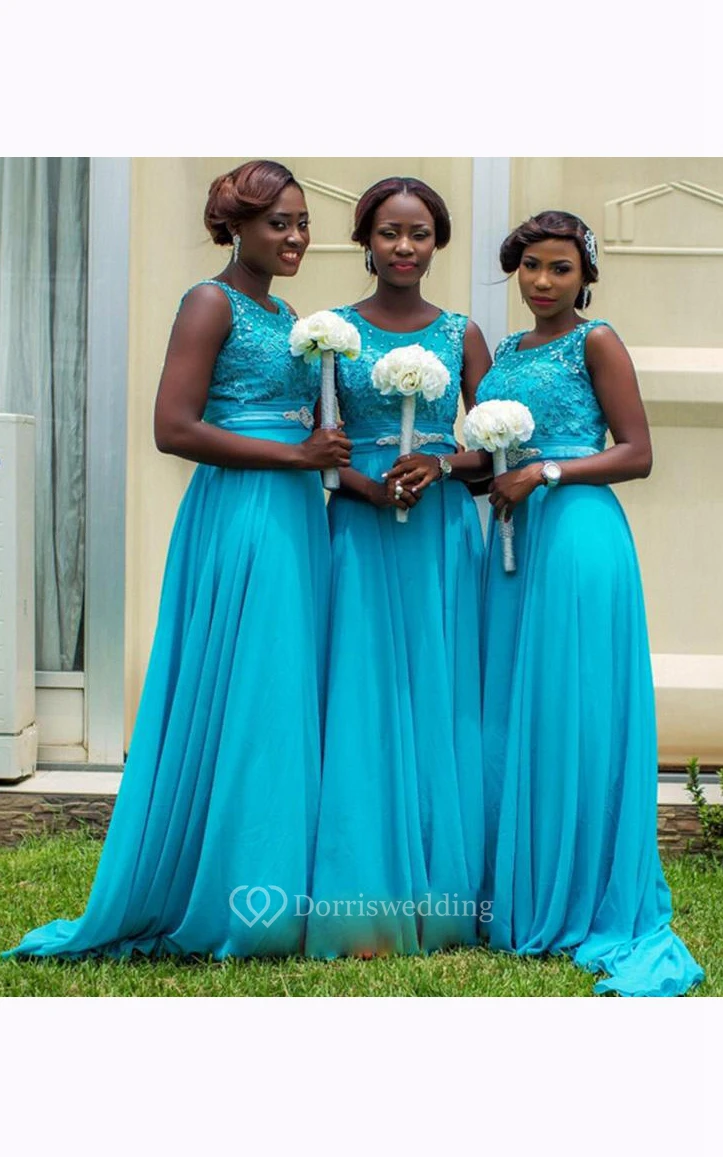A-line Maxi Scoop Straps Sleeveless Bell Chiffon Lace Dress