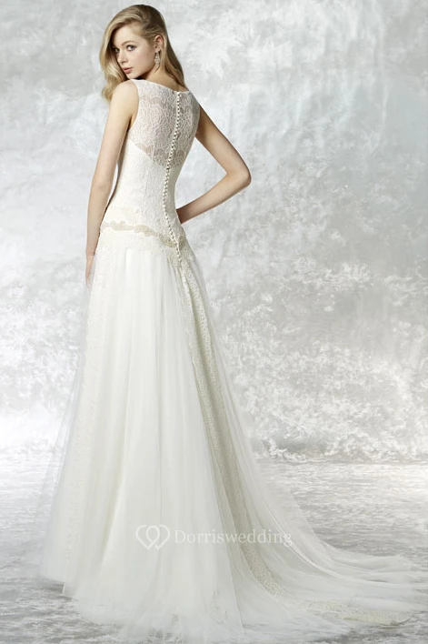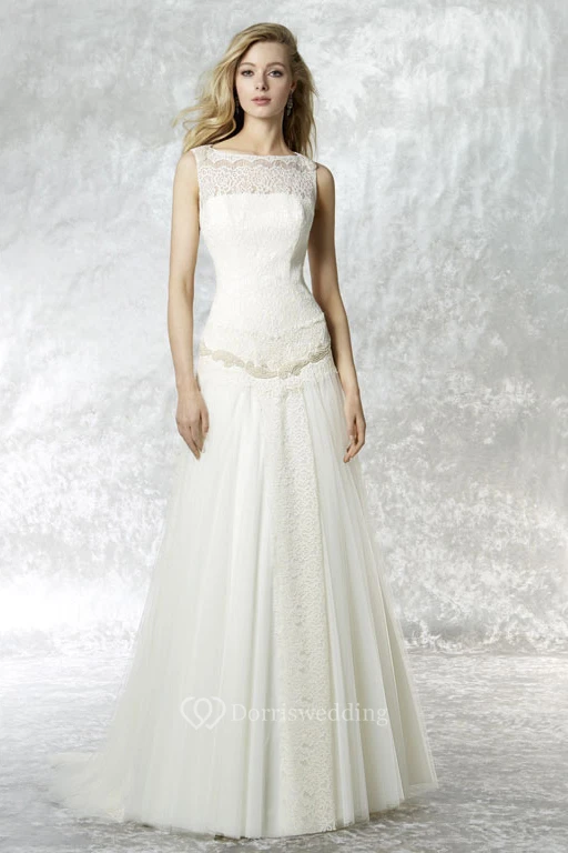 A-Line Maxi Sleeveless Bateau Lace&Tulle Wedding Dress With Illusion Back And Sweep Train