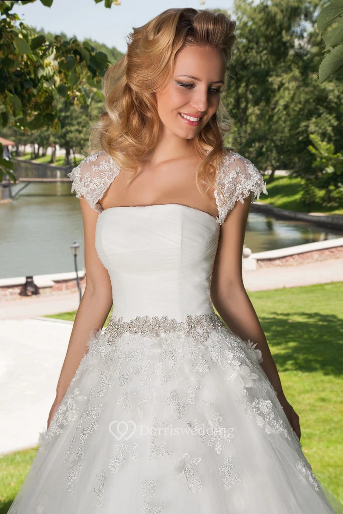 A-Line Maxi Strapless Jeweled Tulle Wedding Dress With Ruching And Cape