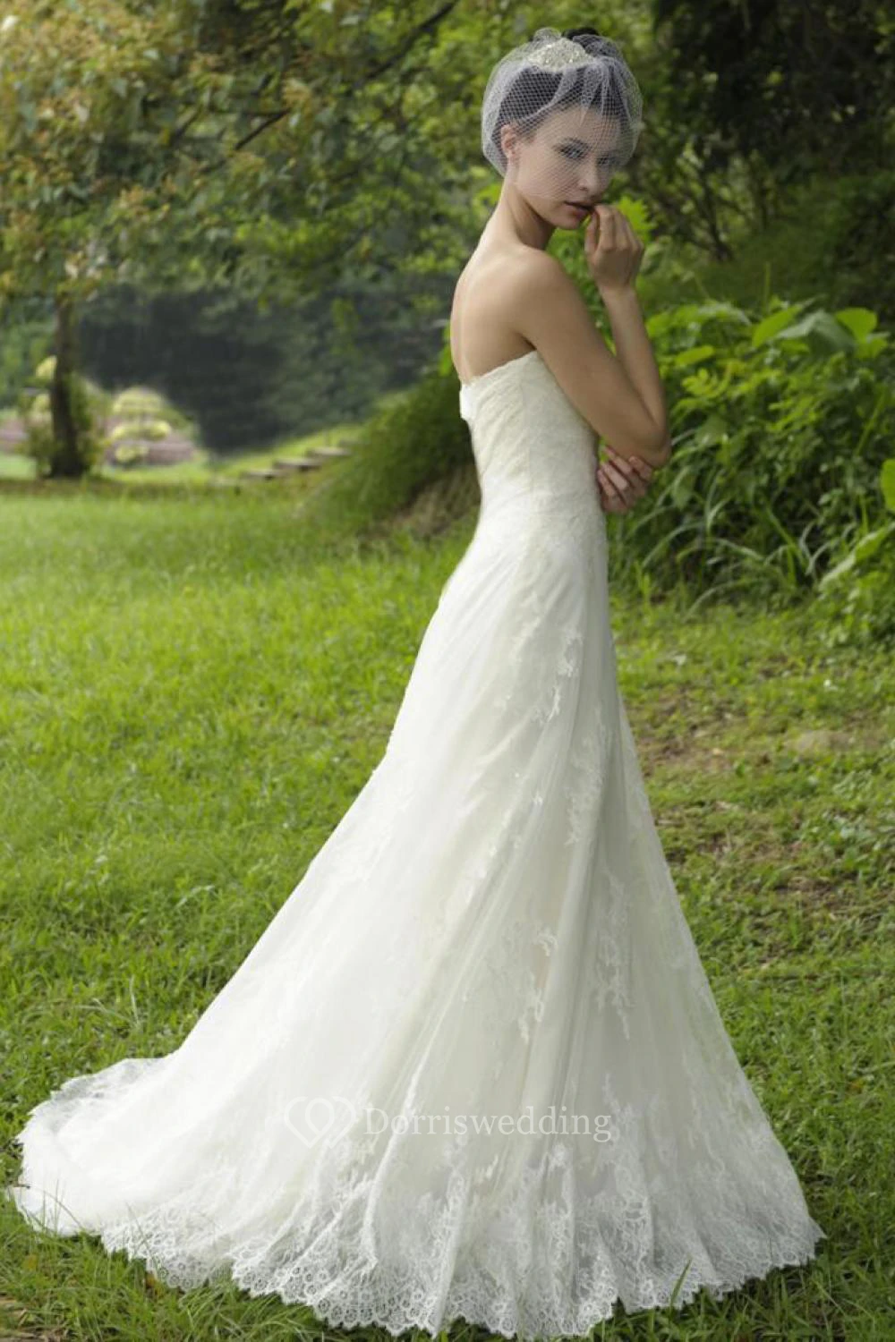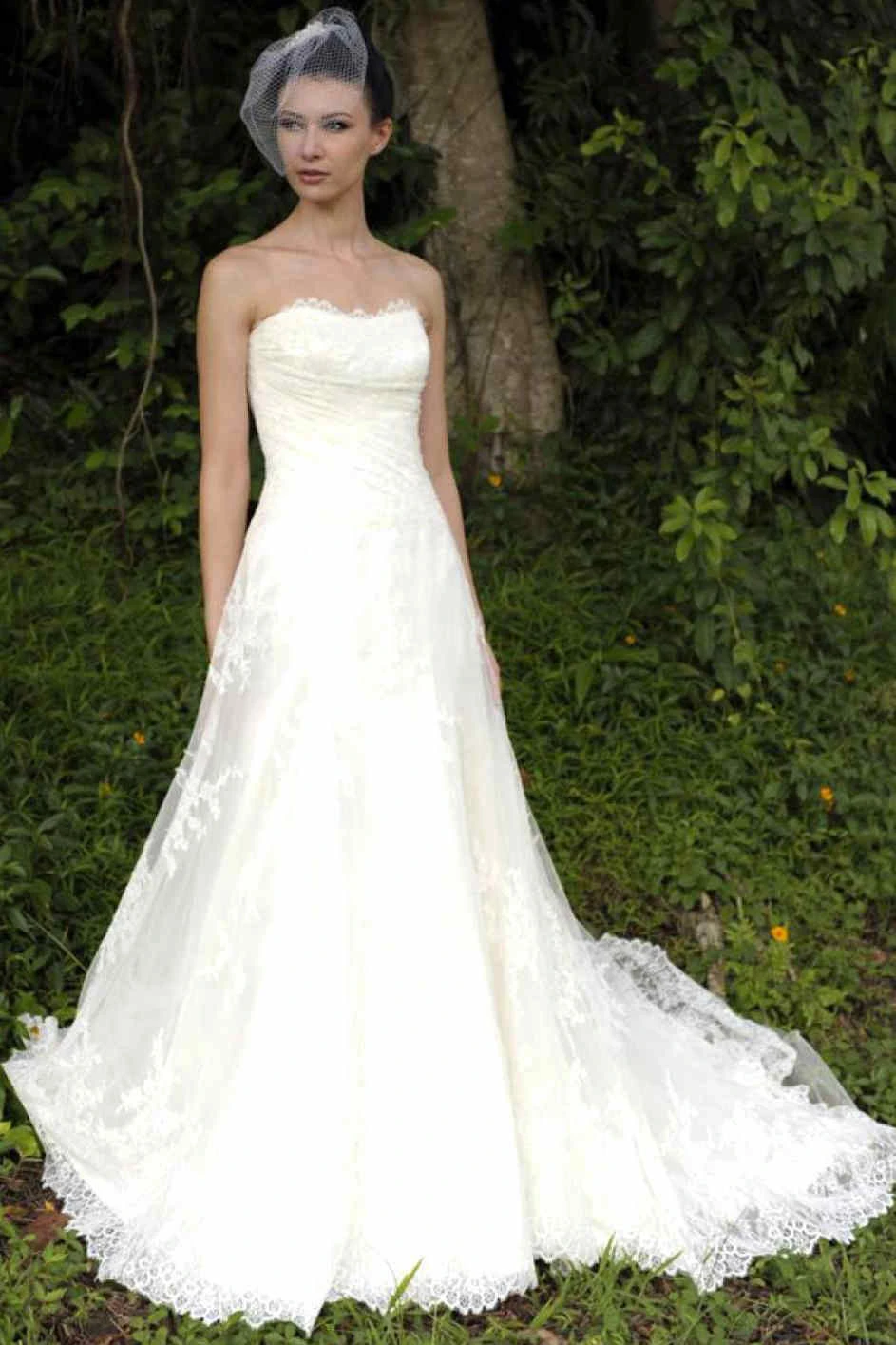 A-Line Maxi Strapless Lace Wedding Dress With Appliques And Court Train