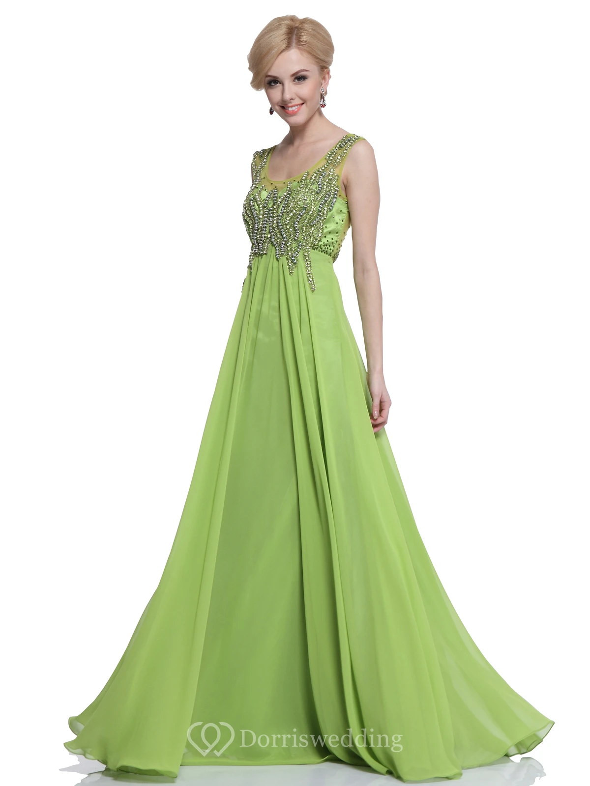 A-Line Maxi V-Neck Sleeveless Empire Chiffon Illusion Dress With Beading And Pleats