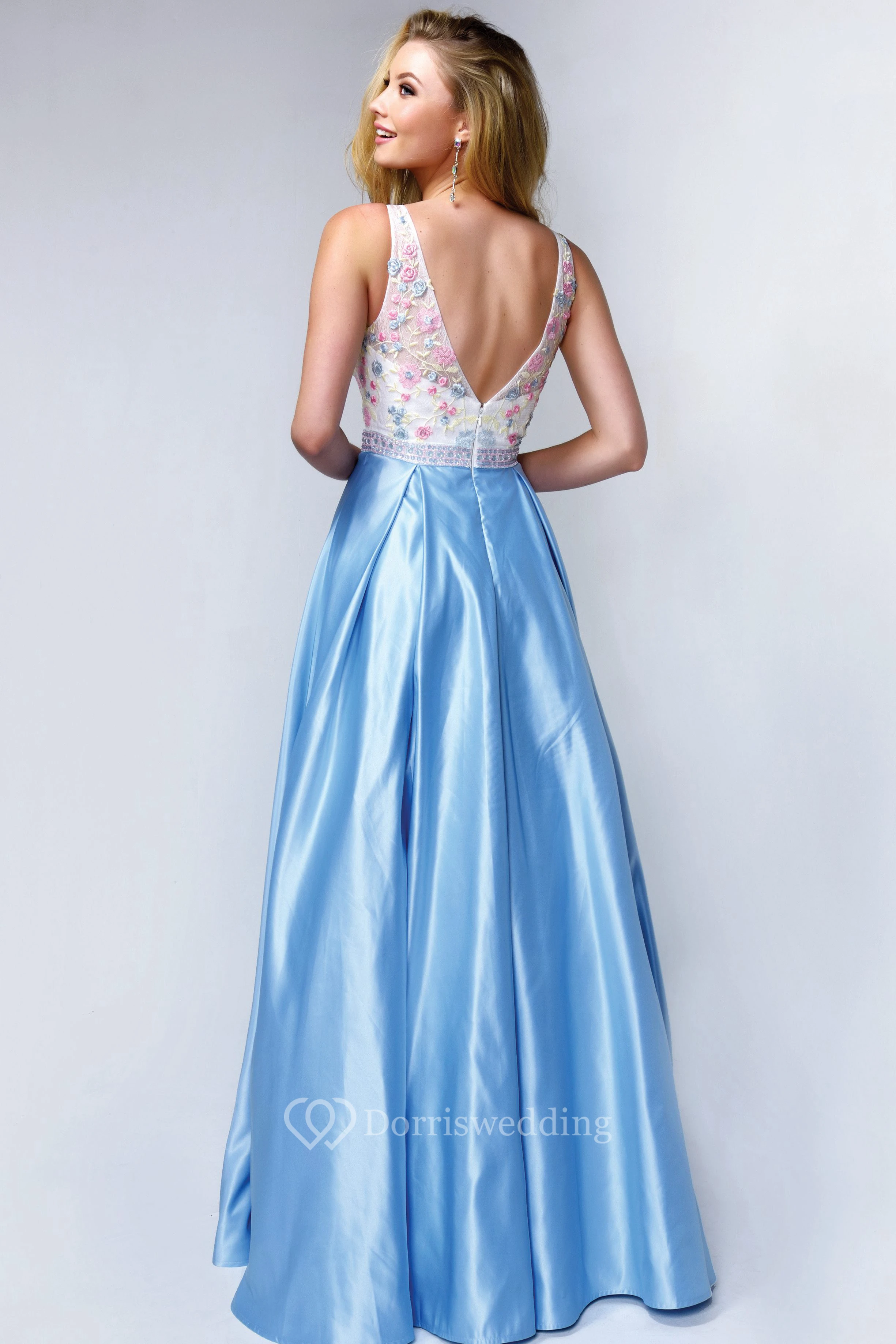 A-Line Maxi V-Neck Sleeveless Satin Low-V Back Dress With Appliques And Pleats