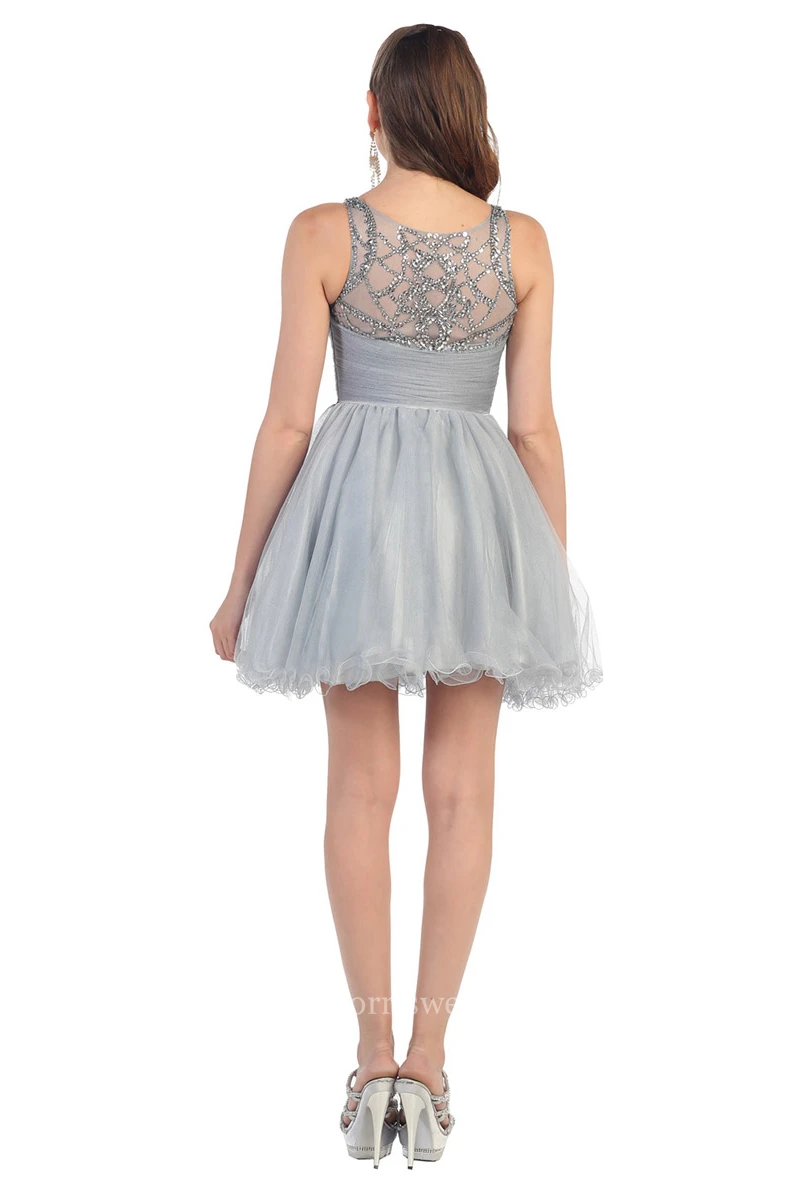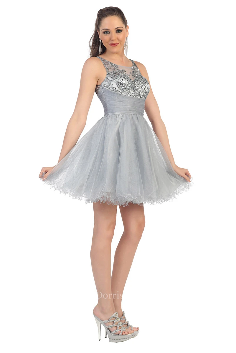 A-Line Mini Bateau Sleeveless Tulle Illusion Dress With Ruffles And Beading