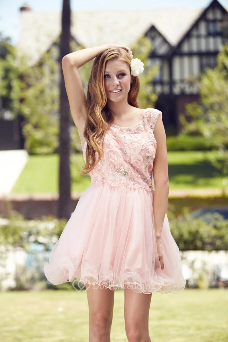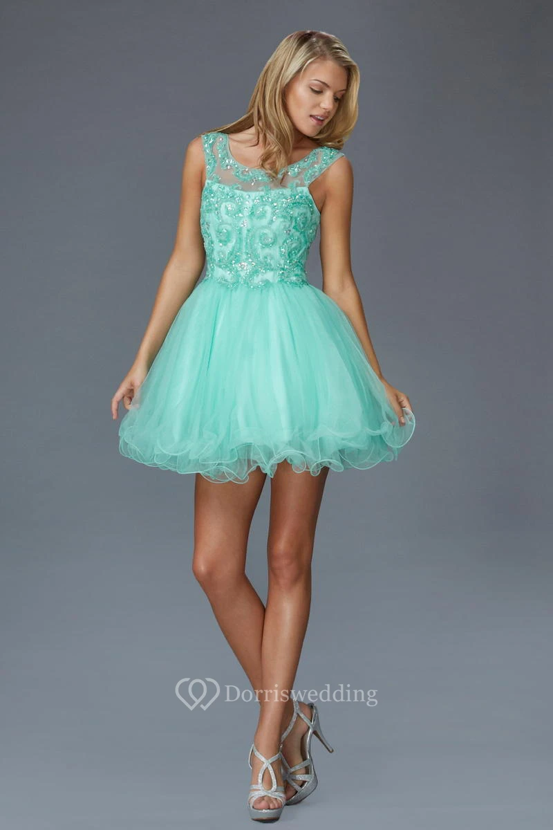 A-Line Mini Bateau Sleeveless Tulle Low-V Back Dress With Sequins And Beading
