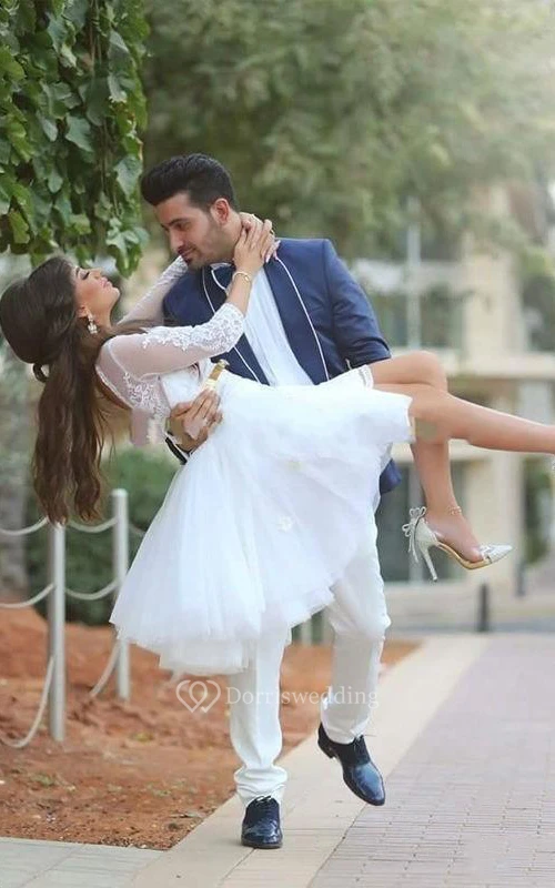 A-Line Mini Jewel Half Sleeve Bell Illusion Appliques Illusion Backless Illusion Lace Dress