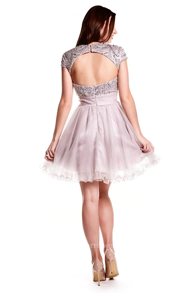 A-Line Mini Scoop Neck Sequined Cap Sleeve Tulle Prom Dress With Keyhole