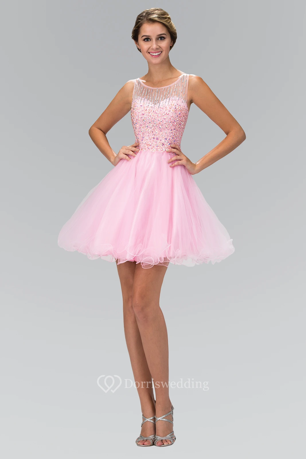 A-Line Mini Scoop-Neck Sleeveless Tulle Illusion Dress With Beading And Ruffles