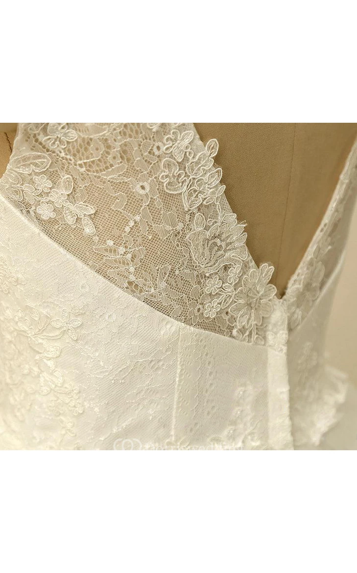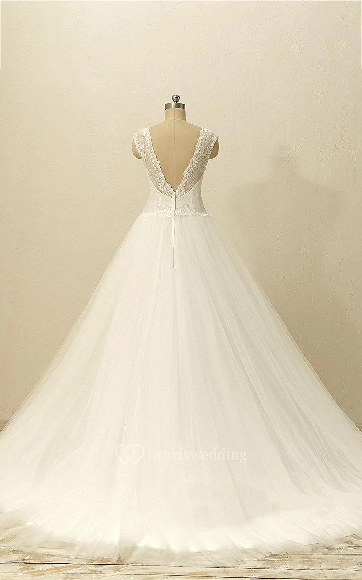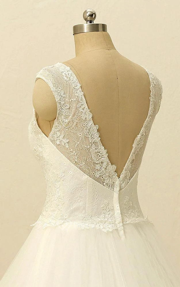A-Line Mini V-Neck Sleeveless Bell Cap Sweep Train Backless Tulle Lace Dress
