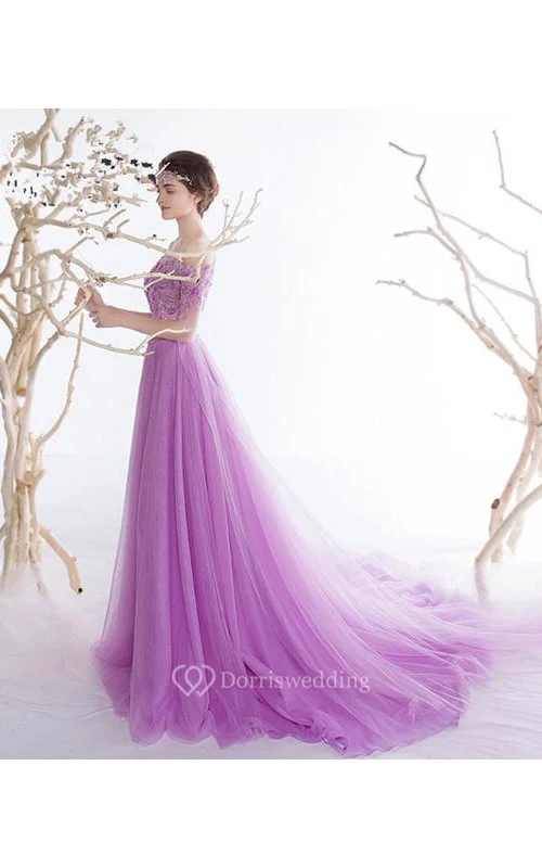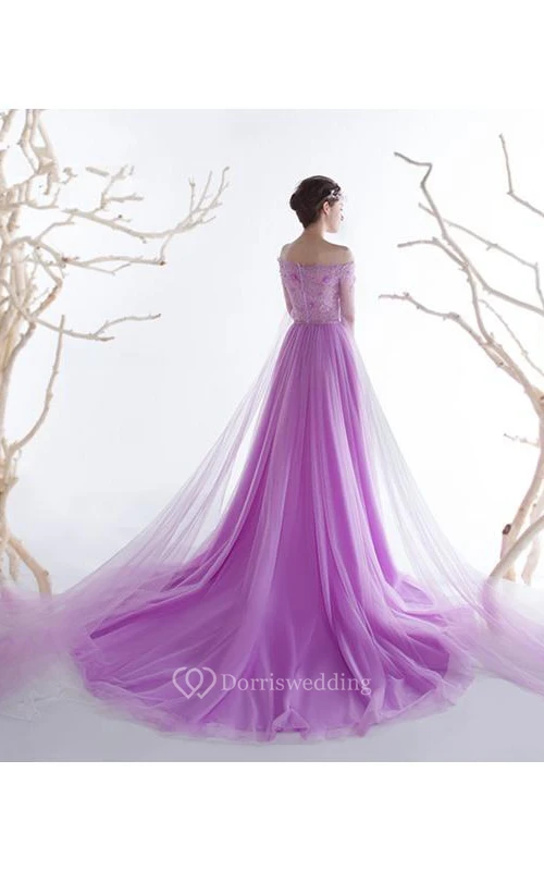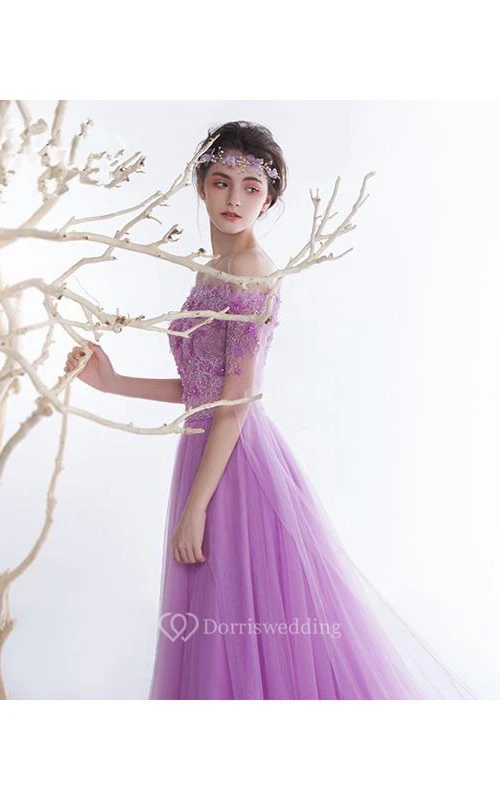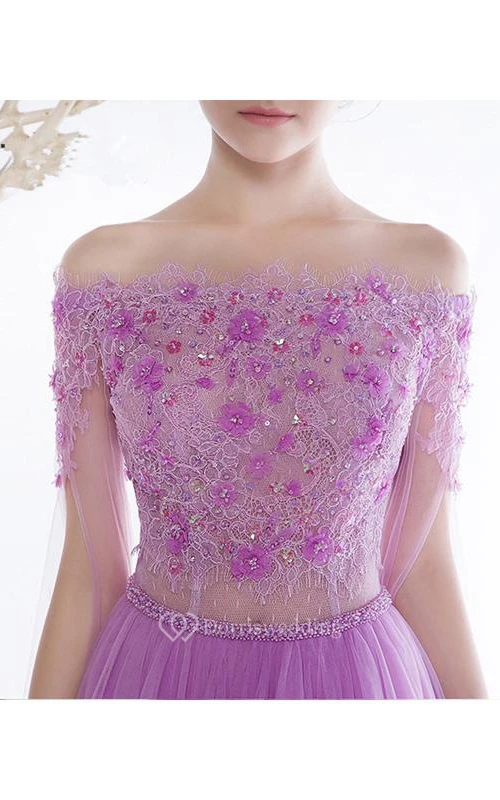 A-Line Off-the-Shoulder Short Sleeves Beading Lace Sequins Prom Dress