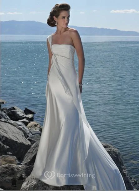 A-Line One Shoulder Beading Satin Court Train Wedding Dress