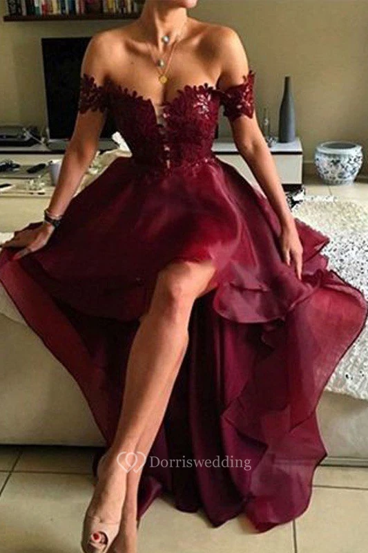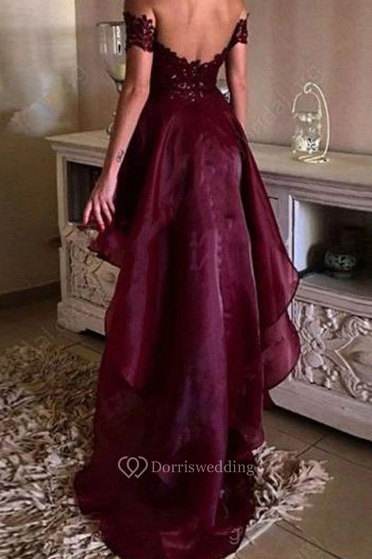 A-Line Organza Lace Off-the-shoulder Short Sleeve Zipper Low-V Back Dress