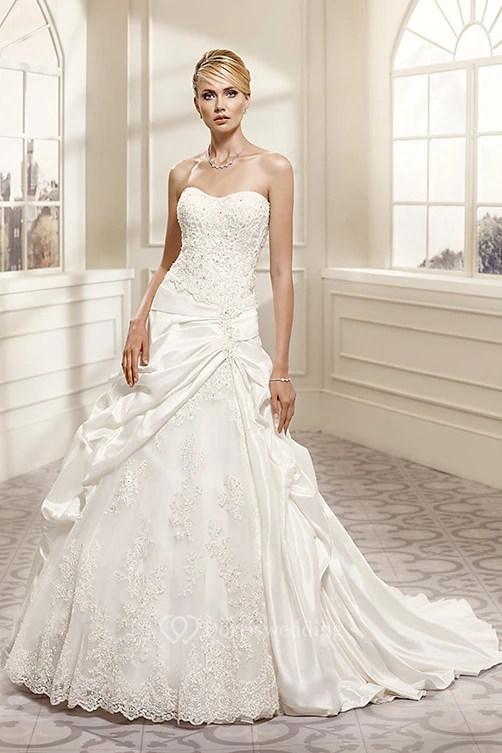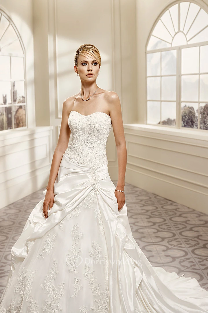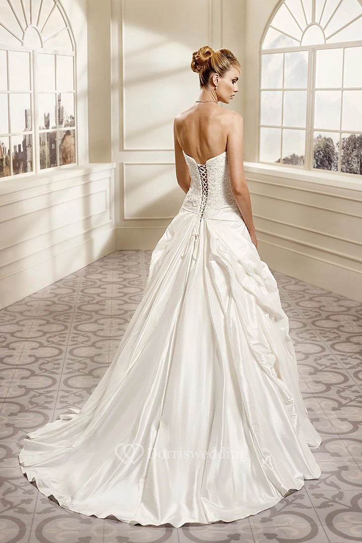 A-Line Pick-Up Sleeveless Floor-Length Strapless Satin&Lace Wedding Dress With Appliques