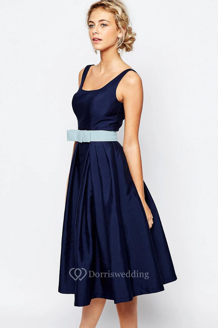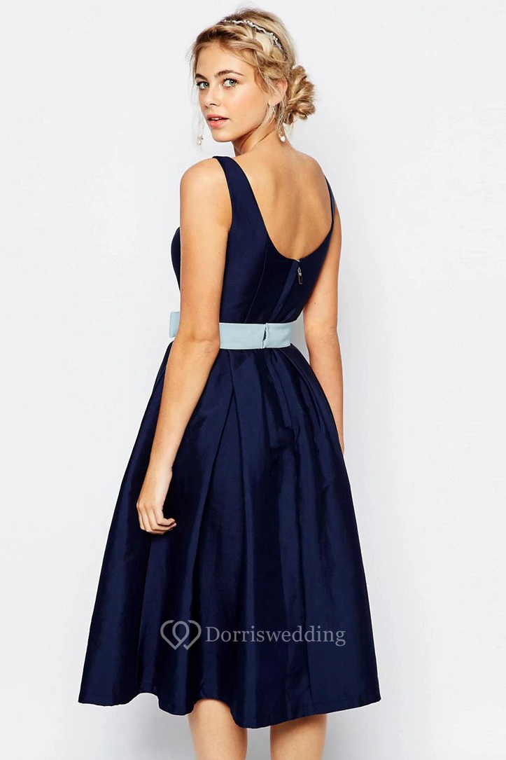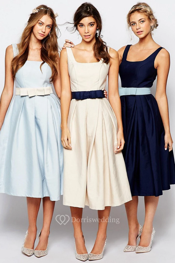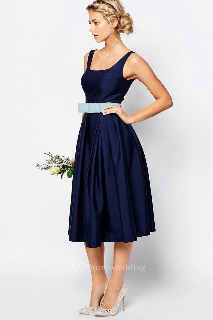 A Line Pleated Short Mini Strapped Sleeveless Satin Bridesmaid Dress With Bow