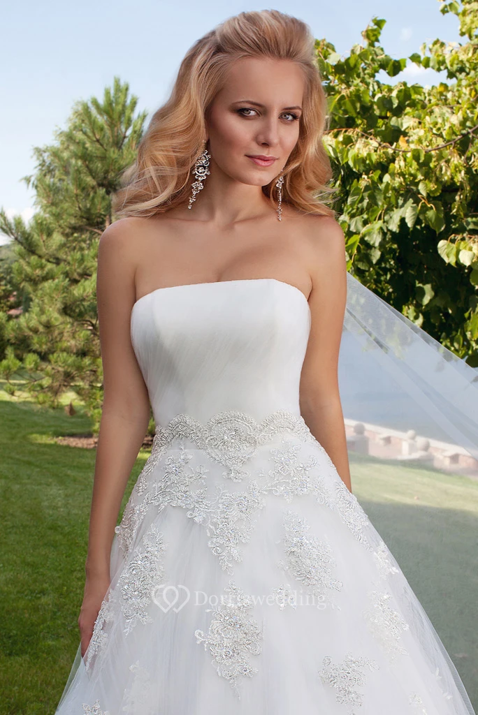 A-Line Pleated Strapless Floor-Length Tulle Wedding Dress With Appliques And Corset Back