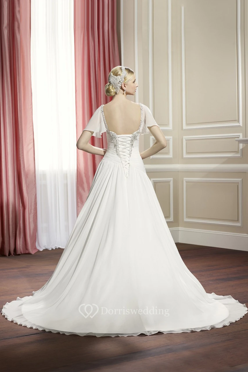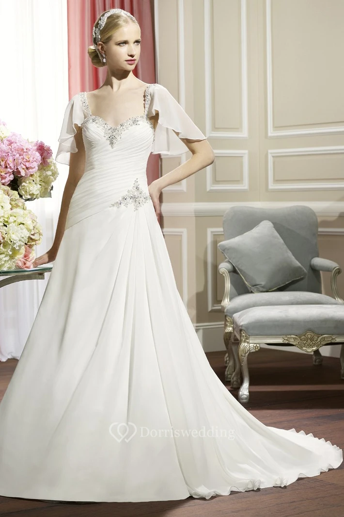 A-Line Poet-Sleeve Long Sweetheart Beaded Wedding Dress With Criss Cross And Draping