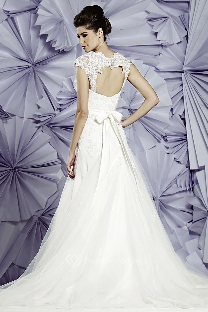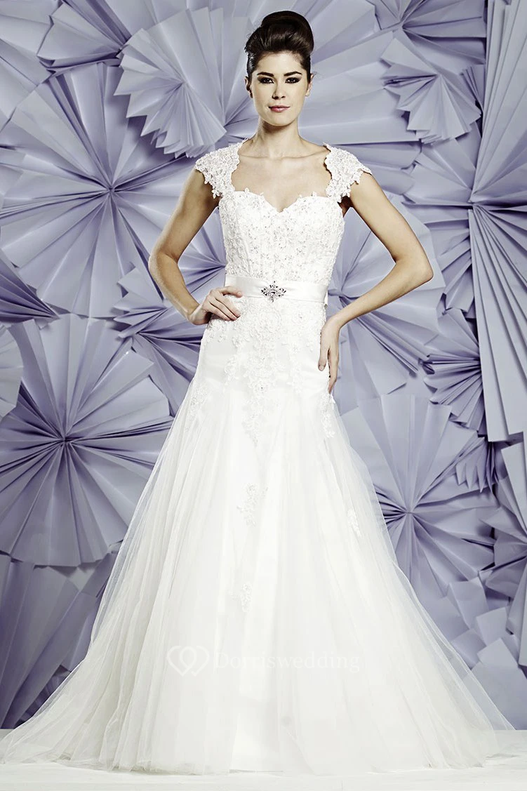 A-Line Queen-Anne Appliqued Long Tulle Wedding Dress With Waist Jewellery And Bow
