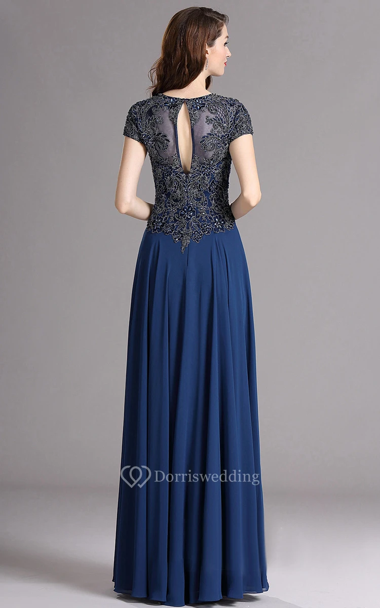 A-Line Queen Anne Short Sleeve Empire Chiffon Appliques Keyhole Dress