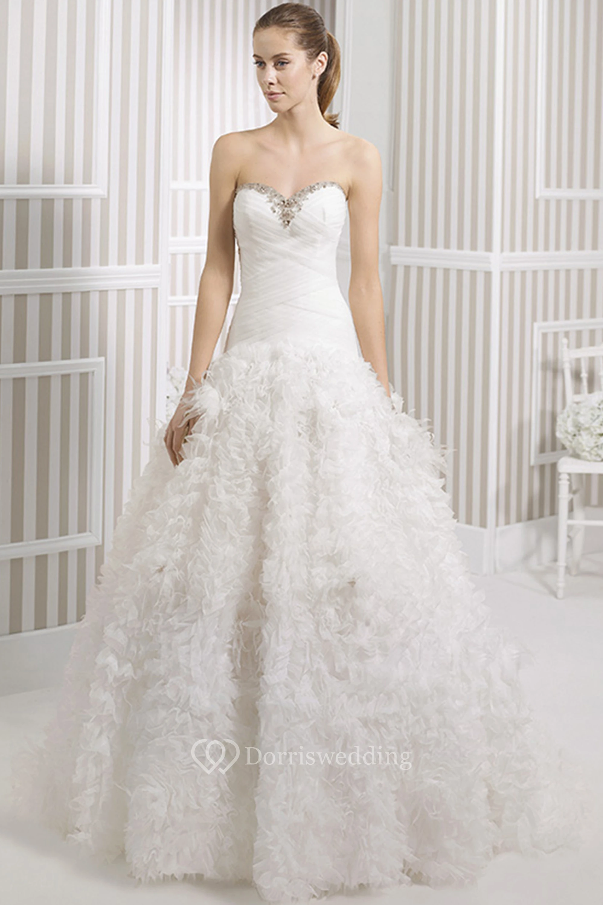 A-Line Ruched Floor-Length Sweetheart Organza Wedding Dress With Ruffles And Beading