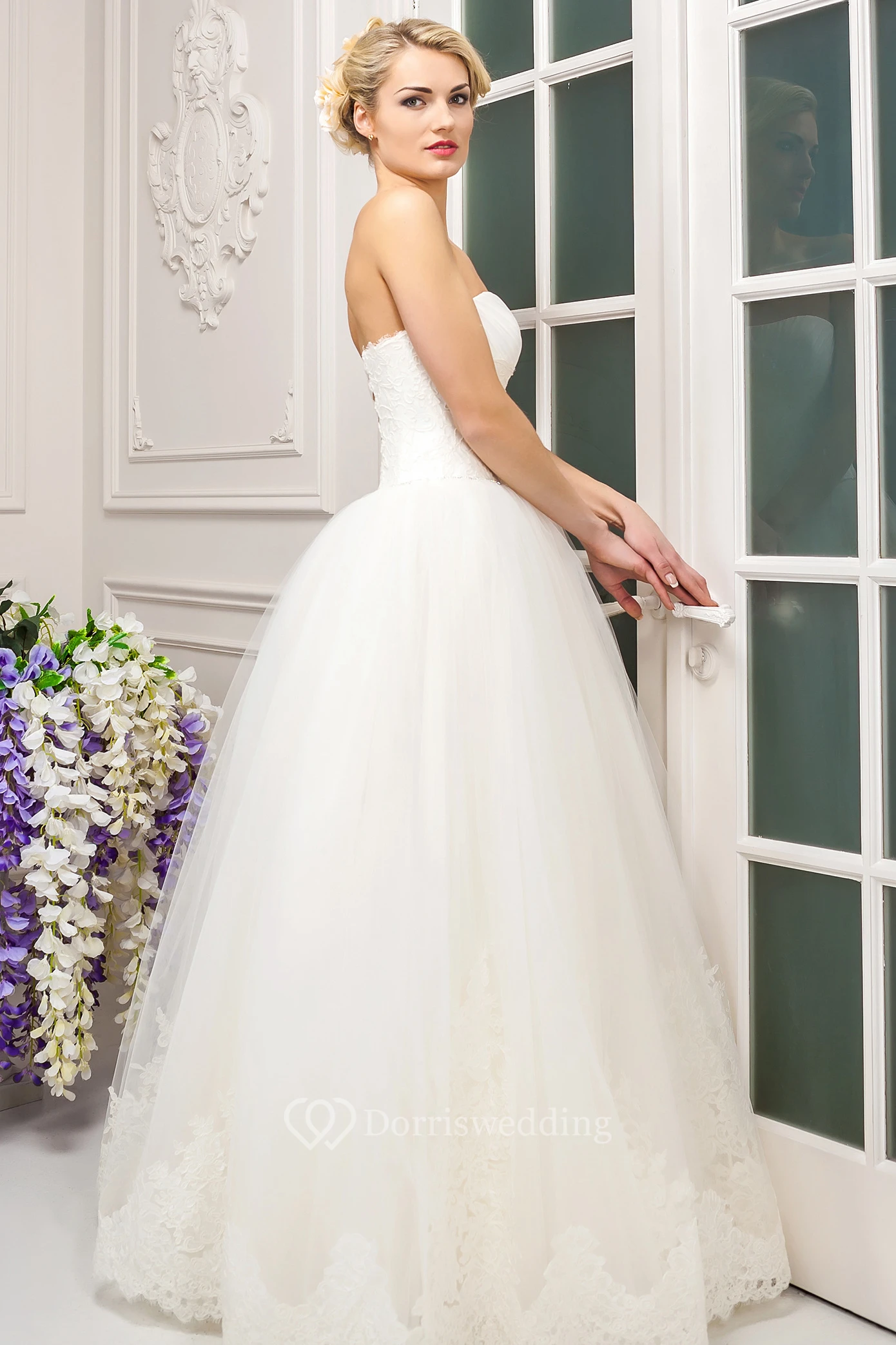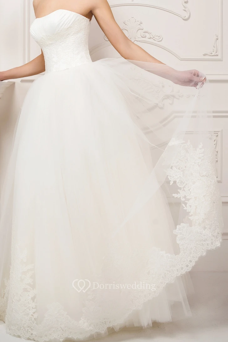 A-Line Ruched Long Strapless Sleeveless Tulle Wedding Dress With Appliques