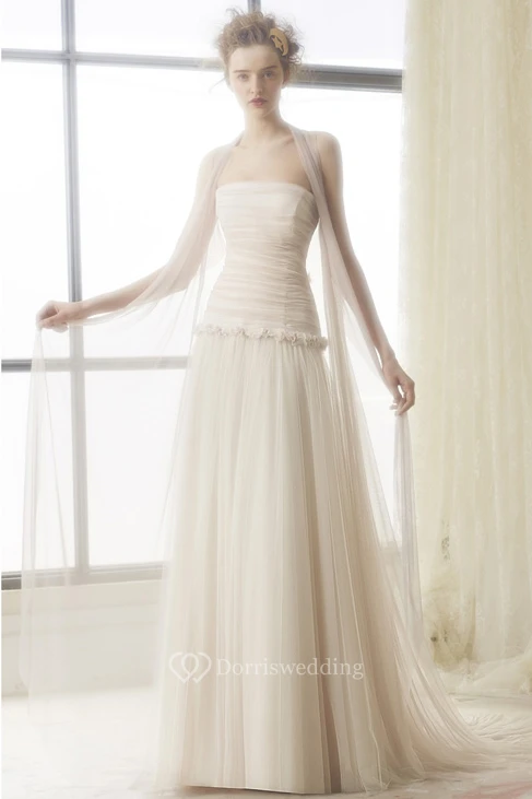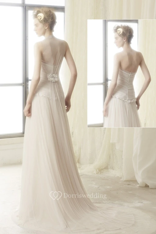 A-Line Ruched Long Strapless Tulle Wedding Dress With Illusion Back And Flower