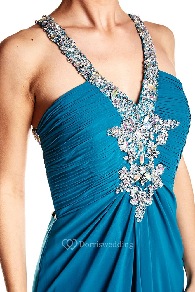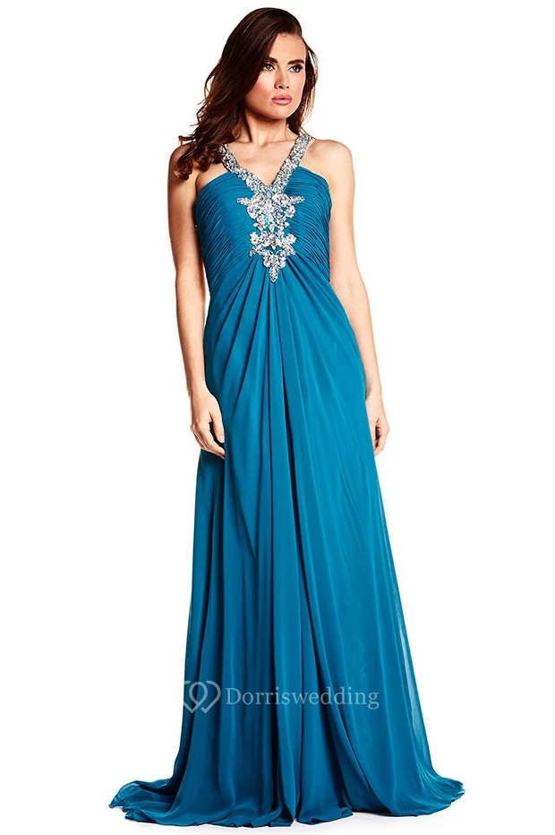 A-Line Ruched Sleeveless Floor-Length Empire Chiffon Prom Dress With Straps And Beading