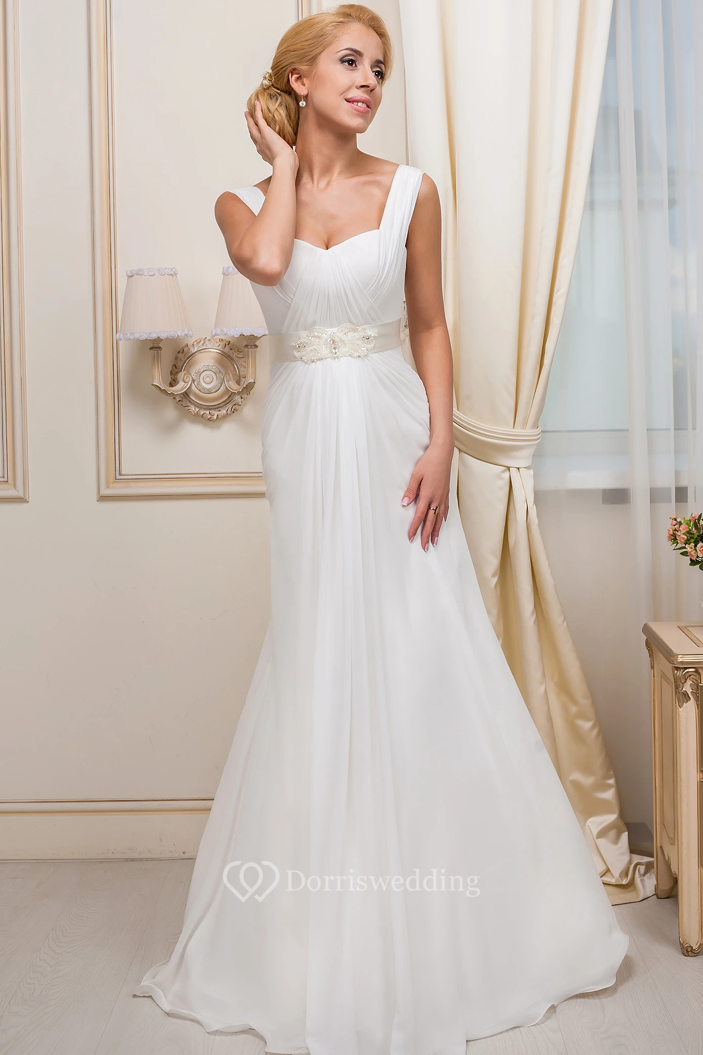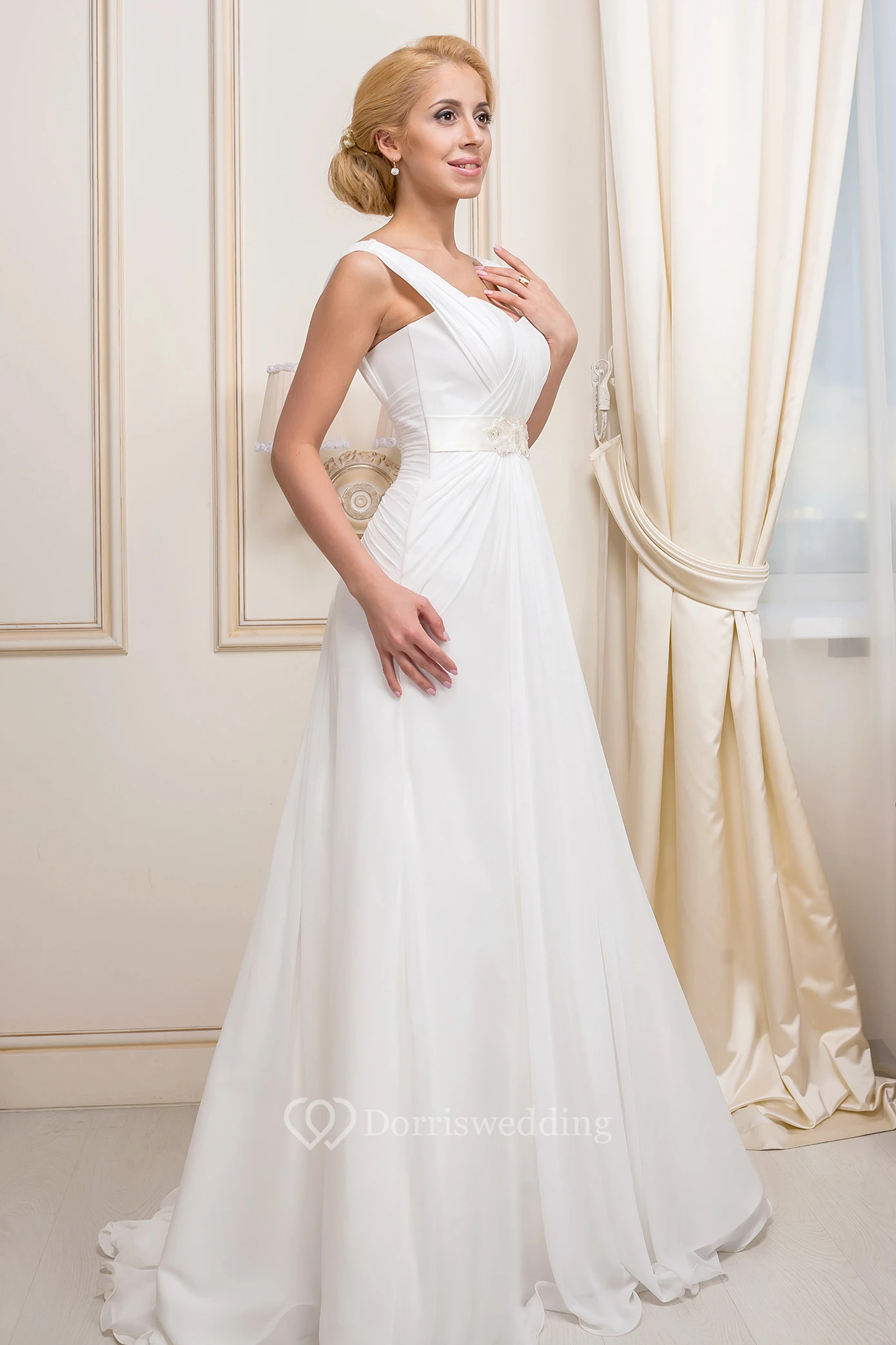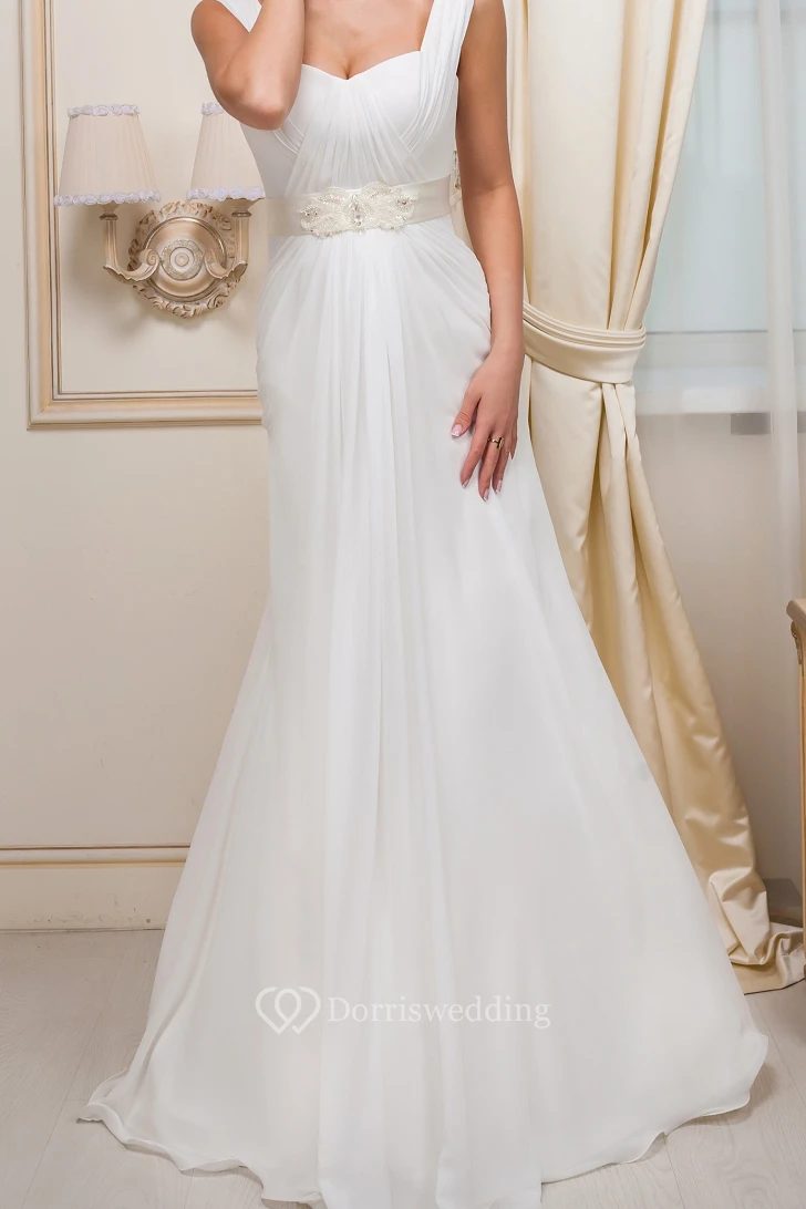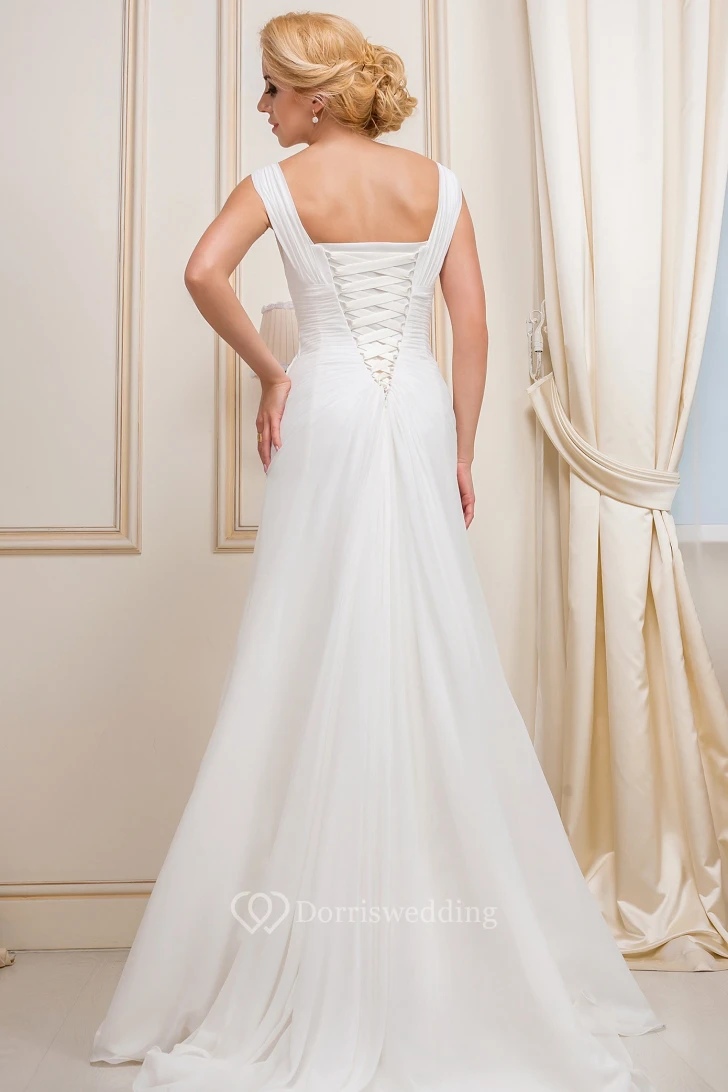A-Line Ruched Sleeveless Floor-Length Strapped Chiffon Wedding Dress