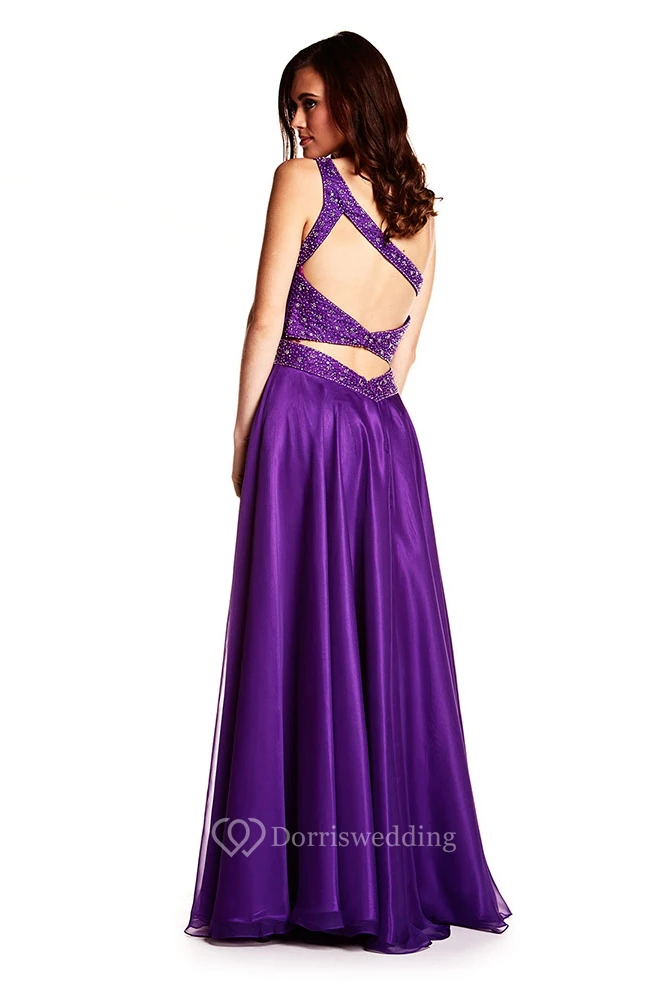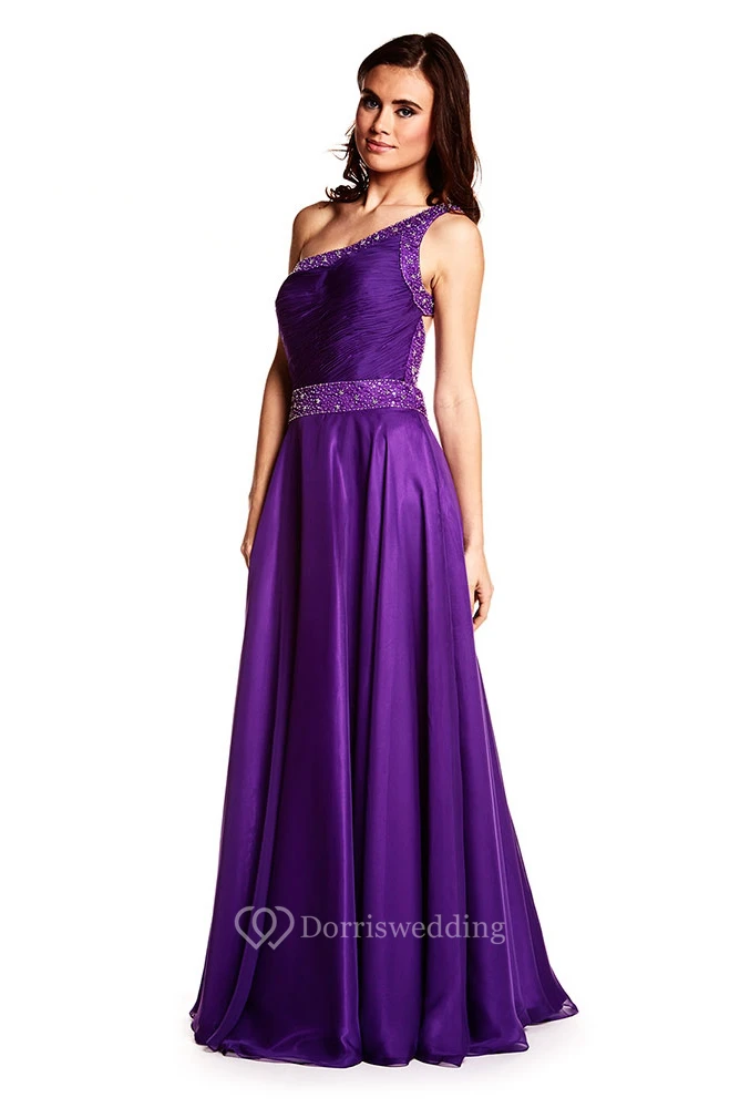 A-Line Ruched Sleeveless One-Shoulder Floor-Length Satin Prom Dress With Beading