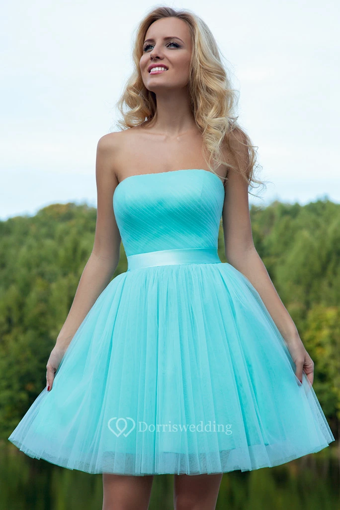 A Line Ruched Sleeveless Strapless Short Mini Tulle Prom Dress With Ribbon