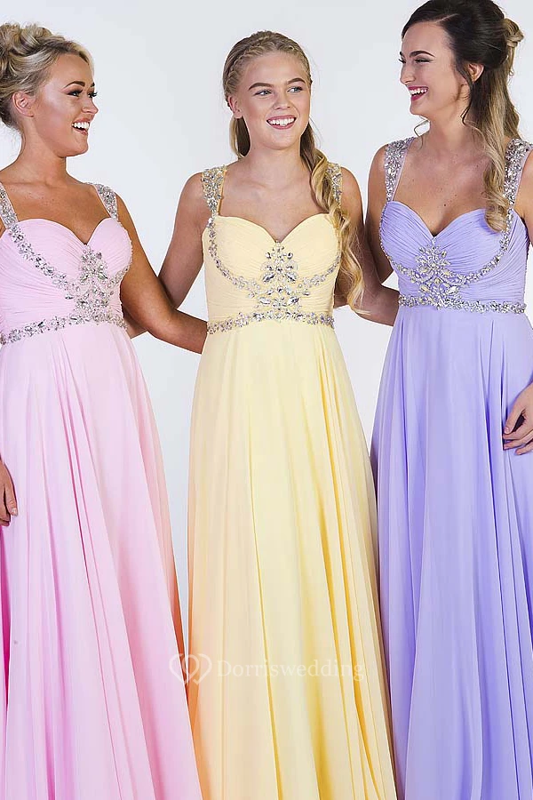 A-Line Ruched Strapped Sleeveless Floor-Length Chiffon Prom Dress With Beading