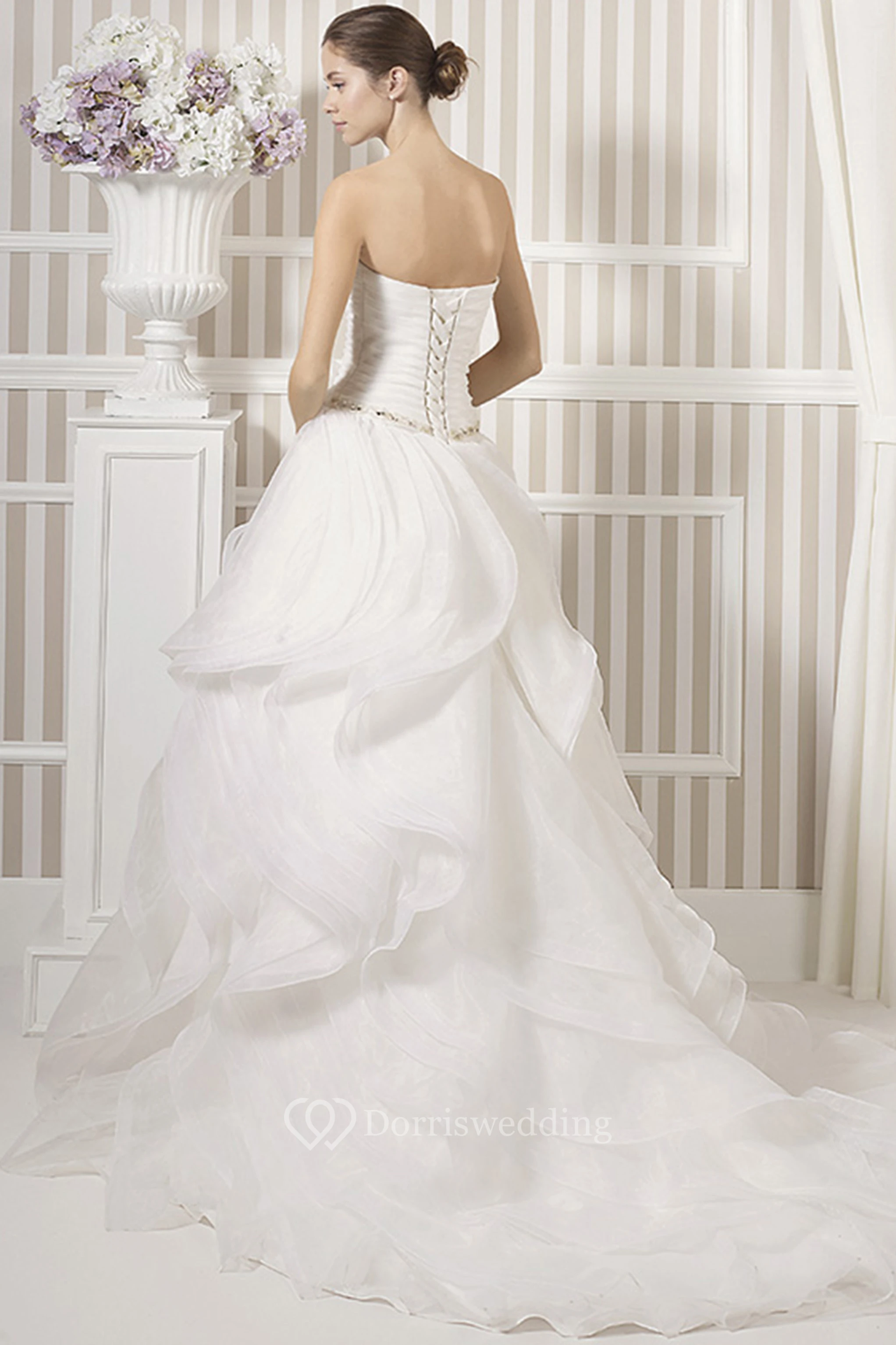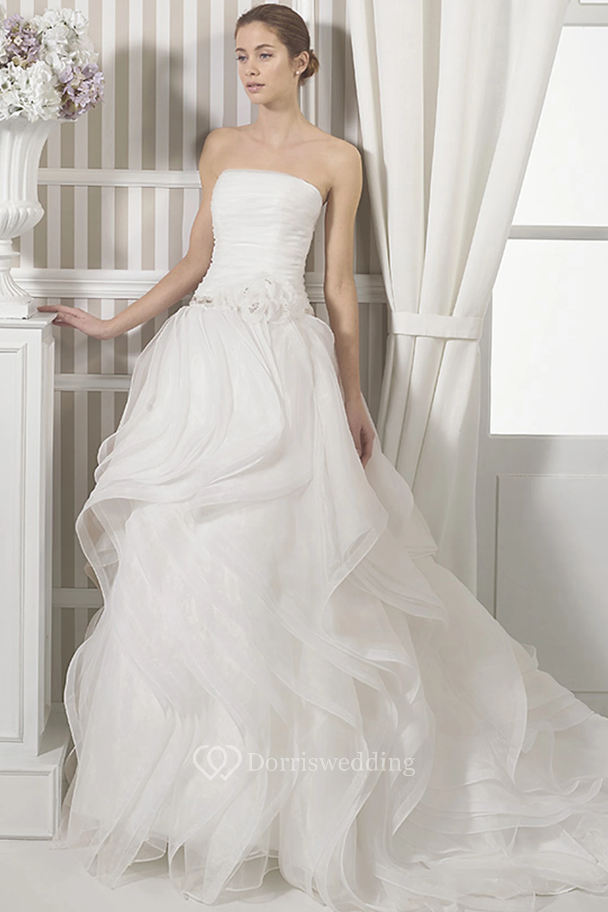 A-Line Ruffled Maxi Sleeveless Strapless Organza Simple Wedding Dress With Flower And Ruching