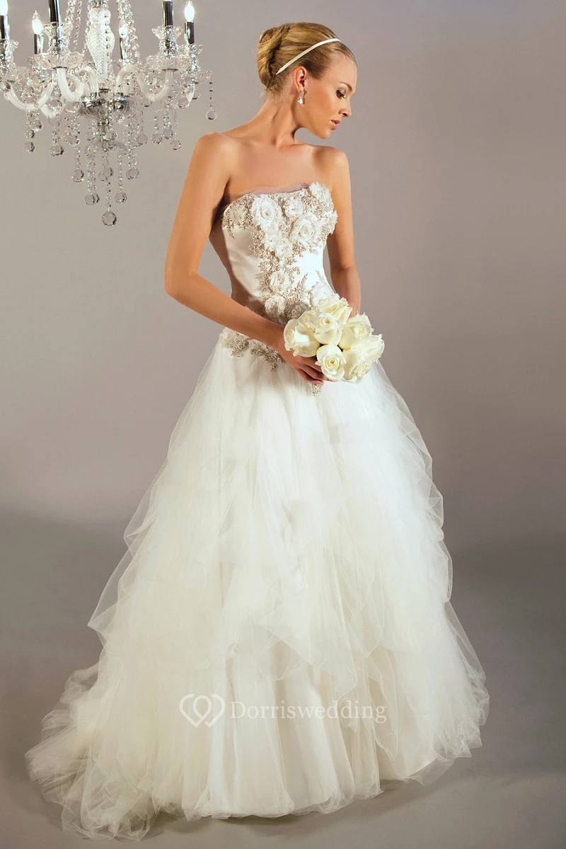 A-Line Ruffled Strapless Long Sleeveless Tulle Wedding Dress With Beading And Flower