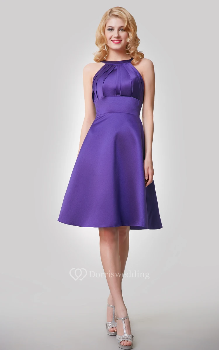 This short satin dress makes the perfect cocktail ensemble. The bodice has an empire waist and a high neckline with pleating. The dress has an A-line silhouette, and the circle skirt hits right at the knee. The dramatic keyhole back is sure to draw everyone’s attention as you walk by, upgrading the simple yet elegant shape of this dress.